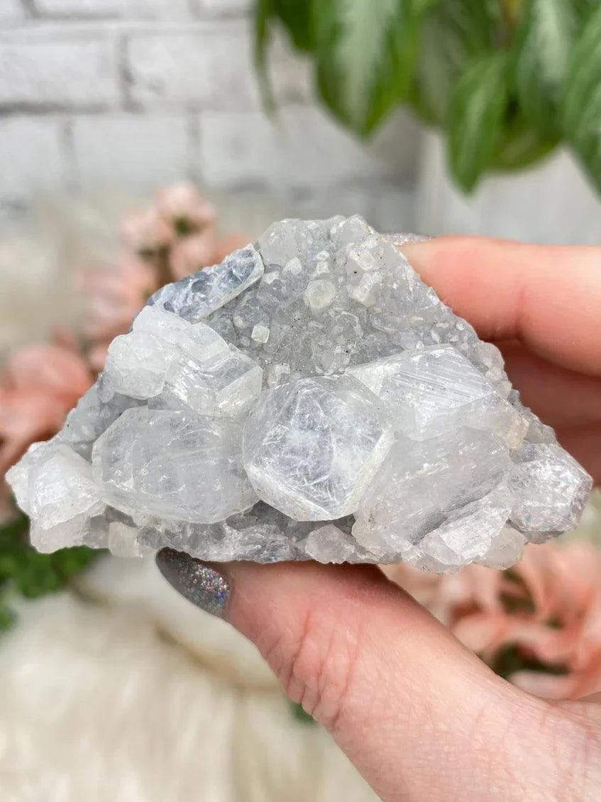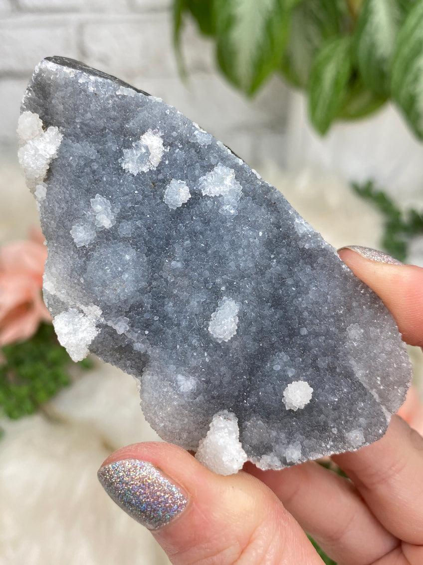 Adorable small gray chalcedony and quartz clusters from India, some apophyllite too. Overall these all have gray hues to them, some light and some darker. Some even have a very subtle blue hue! Almost all of these have incredible sparkle, but a few are a matte finish, but all cool in their own ways! One has okenite even!