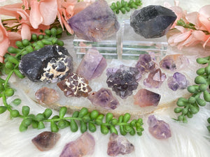 Cute little amethyst clusters and points from Brazil with unique coloring like orange, pink, and nearly black. These have some of the same inclusions as a Super 7, but are not exactly that. Some very cool lines and formations as well.