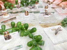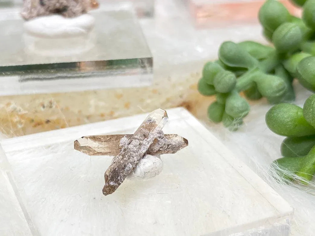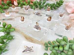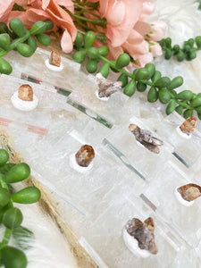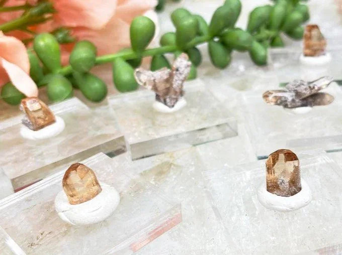 Small amber colored topaz crystals from Utah! These are adorable little pieces that would be great for jewelry making, or just to have some topaz in your collection. There are two different options here, one is for a singular point (usually a larger point or better coloring than the second option), and one option that is more of a 'cluster' and will have 2-3 topaz points. Some of these may also have some rhyolite matrix with them. They will all come mounted on a clear acrylic square, but can easily be removed as it is only earthquake putty.