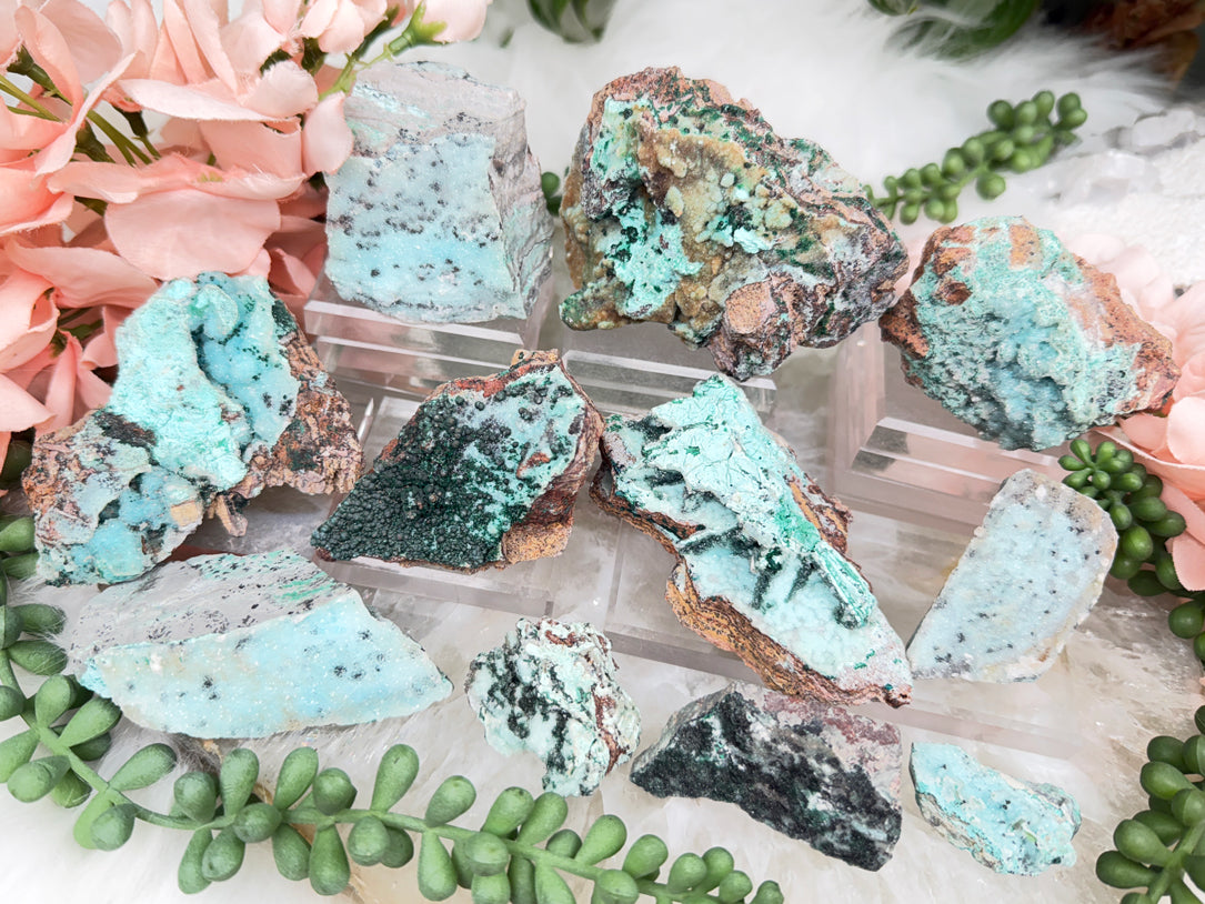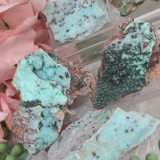 Beautiful aqua blue druzy Chrysocolla many with green Malachite from DR Congo with amazing sparkle (check out the video). These druzy chrysocolla crystals have a sparkly light blue coloring with a little bit of the green malachite (some pieces more than others). Even a lot of the back sides of these pieces are cool to look at! Some has have some brown hues from the matrix material. Love these!