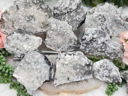 Super sparkly white and gray calcite clusters from Mexico! These little crystals have the most amazing sparkle and shine in person. A couple of them can sit a couple ways. They are a light gray color overall and kind of a mix of white and gray up close. Some of them also have chalcopyrite in them. Be sure to look at the video to really see these in action as they are shown under a couple different lights. Some of them also have yellow and orange inclusions from iron. Many of these (but not all) are actually UV reactive too. They will glow a yellow to green in some spots under UV light. Â