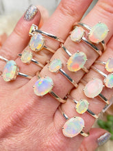 Faceted Sterling Silver Ethiopian Dry Opal rings for sale with simple bands. These Ethiopian dry opals have an oval faceted cut to give more sparkle and shine. The sterling silver bands are simple and classic with prong settings. The opals will be a wide range of colors including red, yellow, orange, blue, and green for the most part. There are two opal size options for you to choose from!