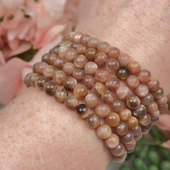 These moonstone sunstone bracelets have an orange elastic inside a light orange to brown bead that is approximately 6-7mm in size.