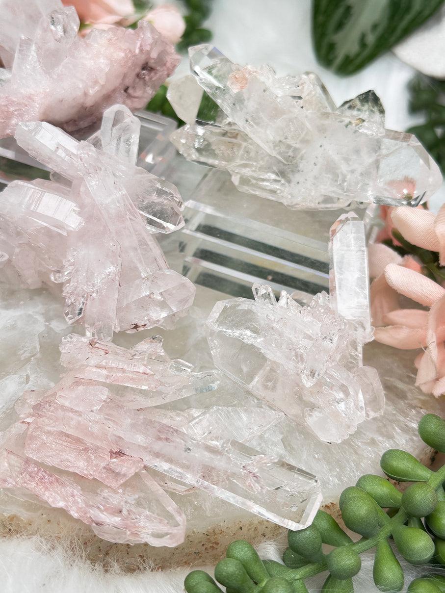 Very cool pieces of Colombian Quartz most with tabular formations, and some with twins (or more) growths, and other really unique growth patterns. Most of these are a pink quartz, but a couple are clear quartz. A few also have green chlorite in them. Take a look at the video to see how they sit (or lay) as well as a full 360 look at each piece.
