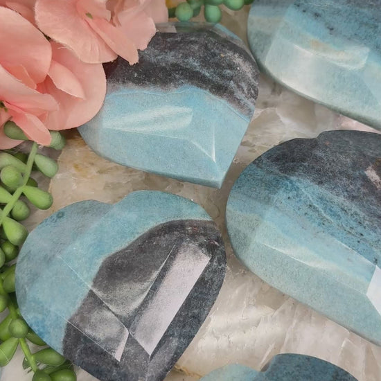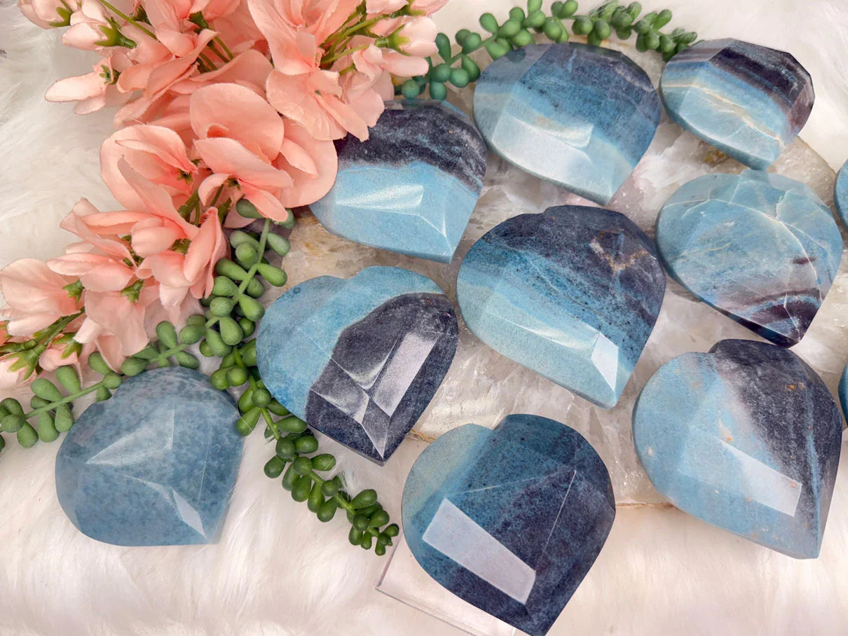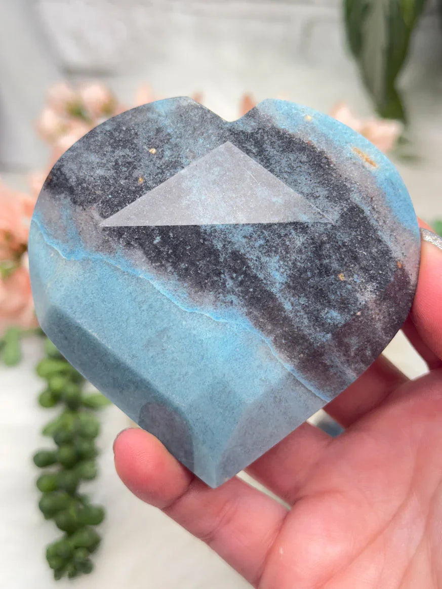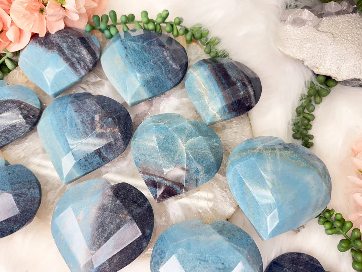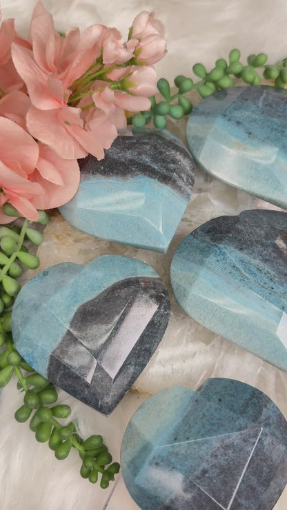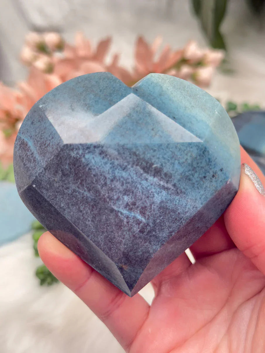 Beautiful naturally colored Blue Trolleite hearts from Brazil. These Trolleite hearts have a faceted geometric cut to them giving some extra pizazz.  Trolleite has a wide range of blue colors from a deep navy blue to a vibrant (but soft) aqua teal coloring.  These are no exception! Choose your exact heart.