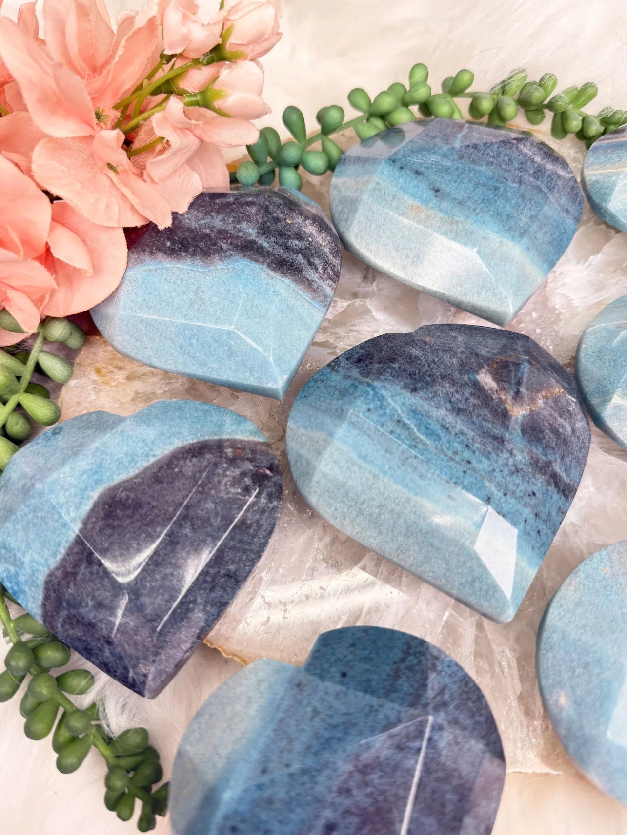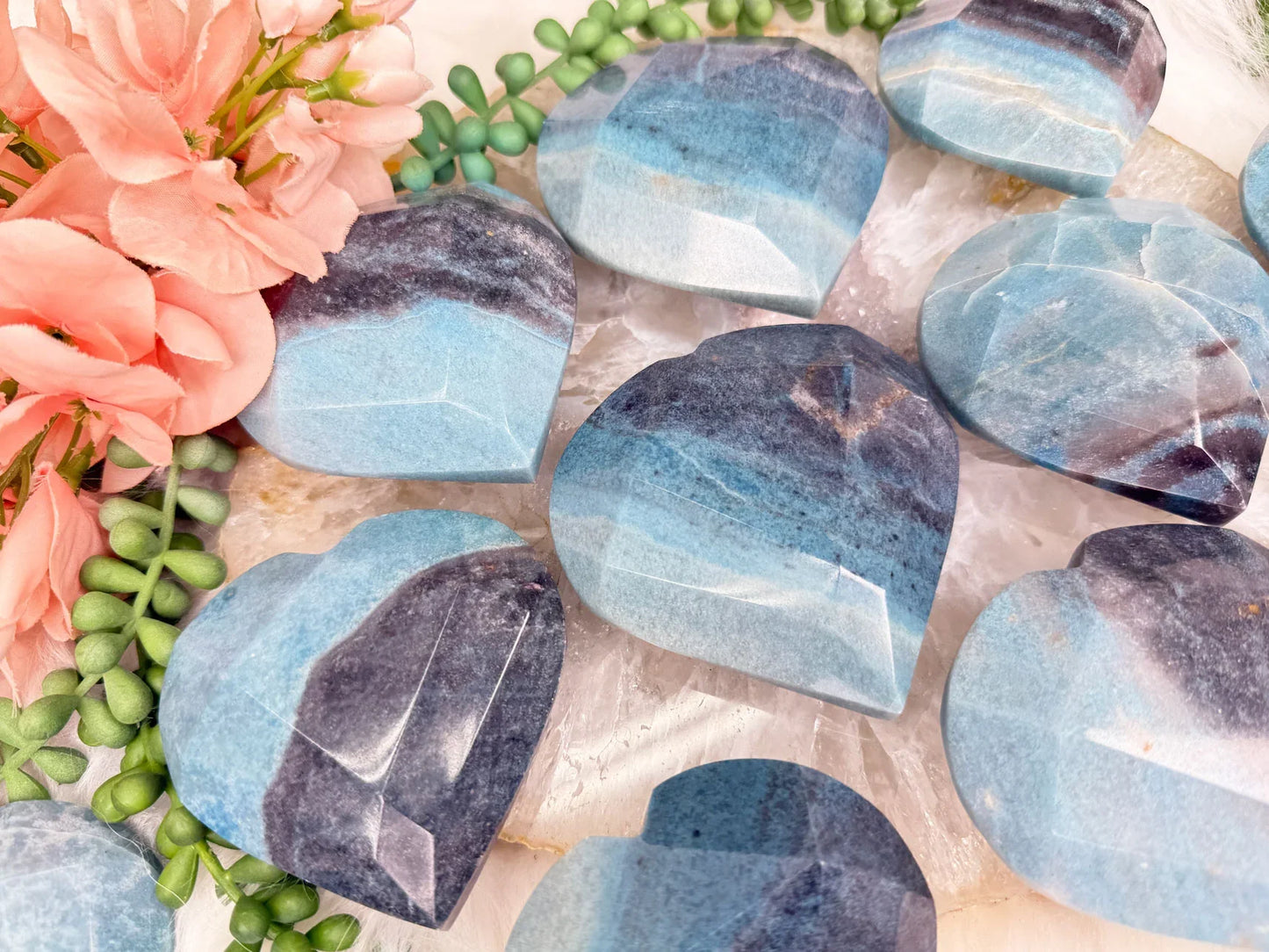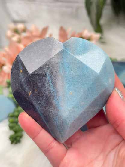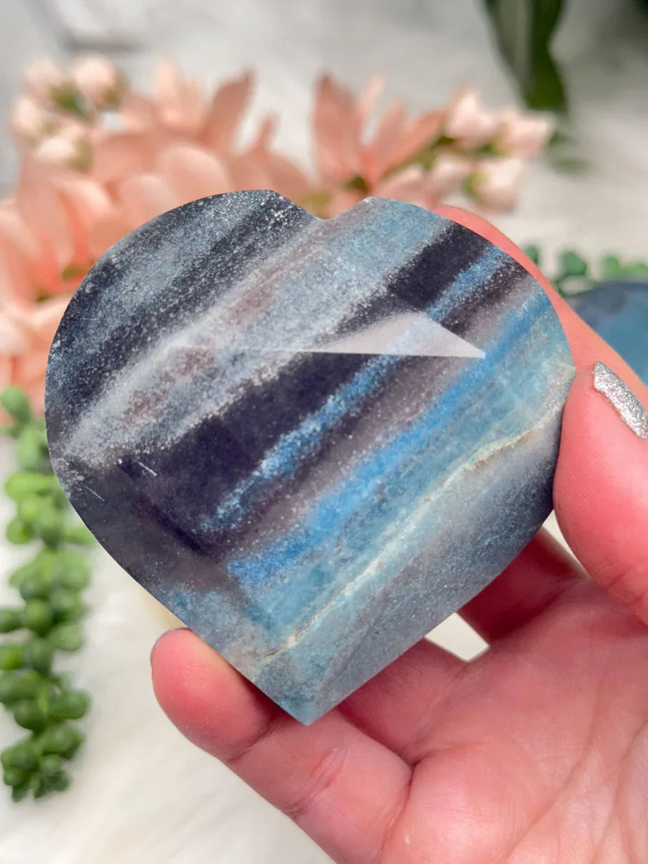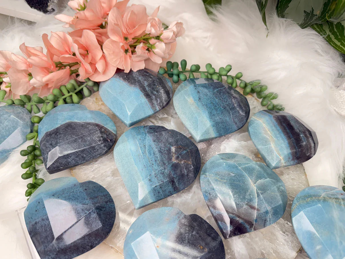 Beautiful naturally colored Blue Trolleite hearts from Brazil. These Trolleite hearts have a faceted geometric cut to them giving some extra pizazz.  Trolleite has a wide range of blue colors from a deep navy blue to a vibrant (but soft) aqua teal coloring.  These are no exception! Choose your exact heart.