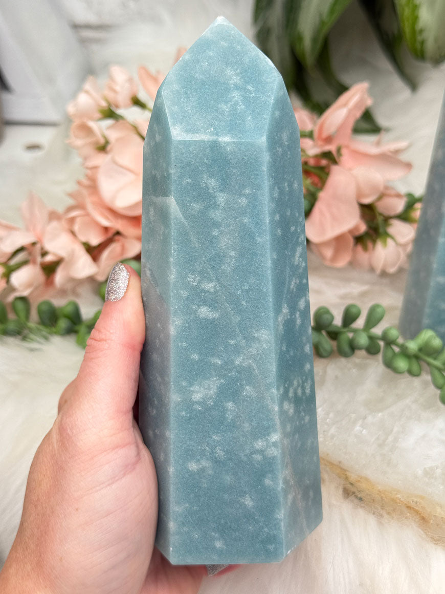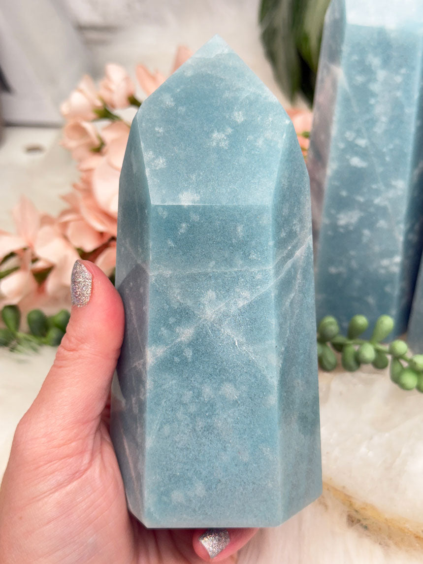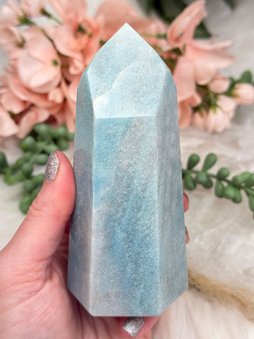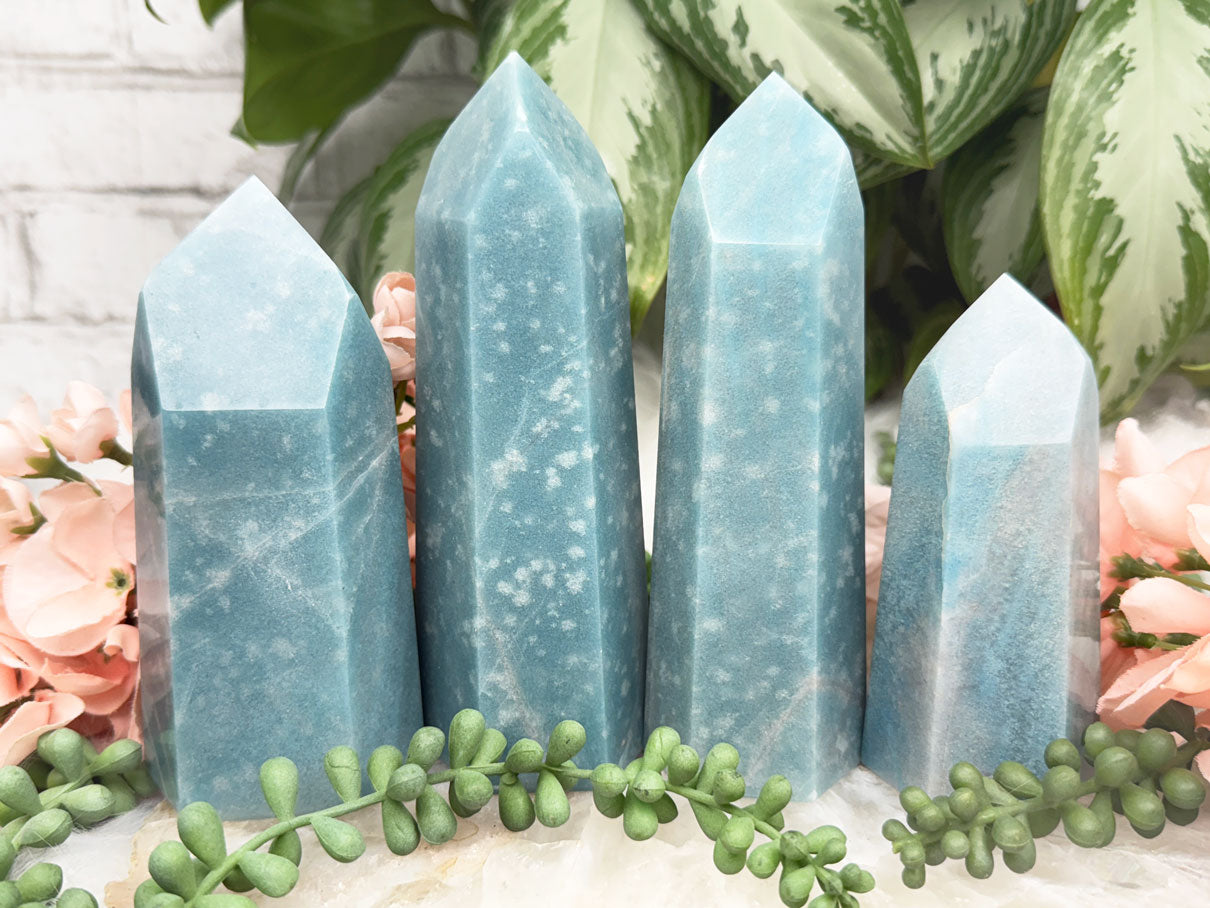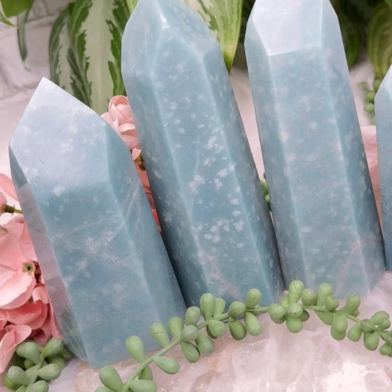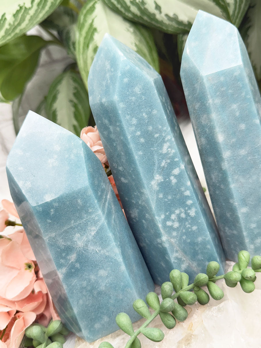 Beautiful naturally colored Blue Trolleite points from Brazil. These Trolleite points have the most calming teal blue coloring making them perfect for some ocean vibes if you have beach decor. Â Each one is unique, some with lines, some with a few different blue hues and some with spots that almost look like bubbles in water. Â You will get to choose your exact point!