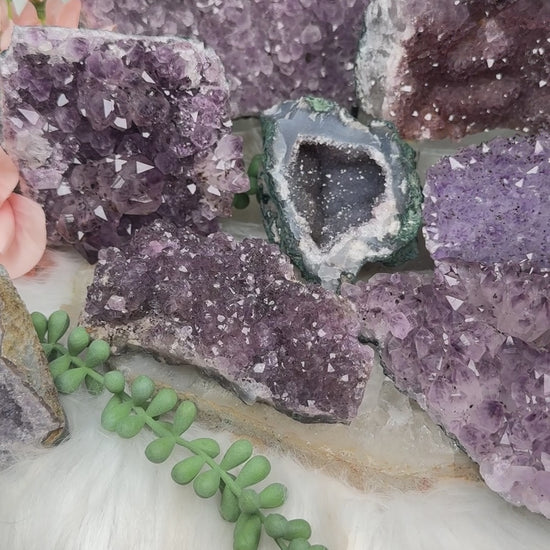 Beautiful purple amethyst clusters from Brazil in a range of formations and sizes. From super sparkly chunky formations to a small geode, there is a perfect stone for everyone. Some have goethite in them, some have gold rutile, and there are even a couple hollandite bursts. The large one back left has white UV reactive calcite that glows light pink under UV light. Some of these have pineapple formations. Most of these can only lay flat. Take a look at the video to seem them 360 in different lighting.Â