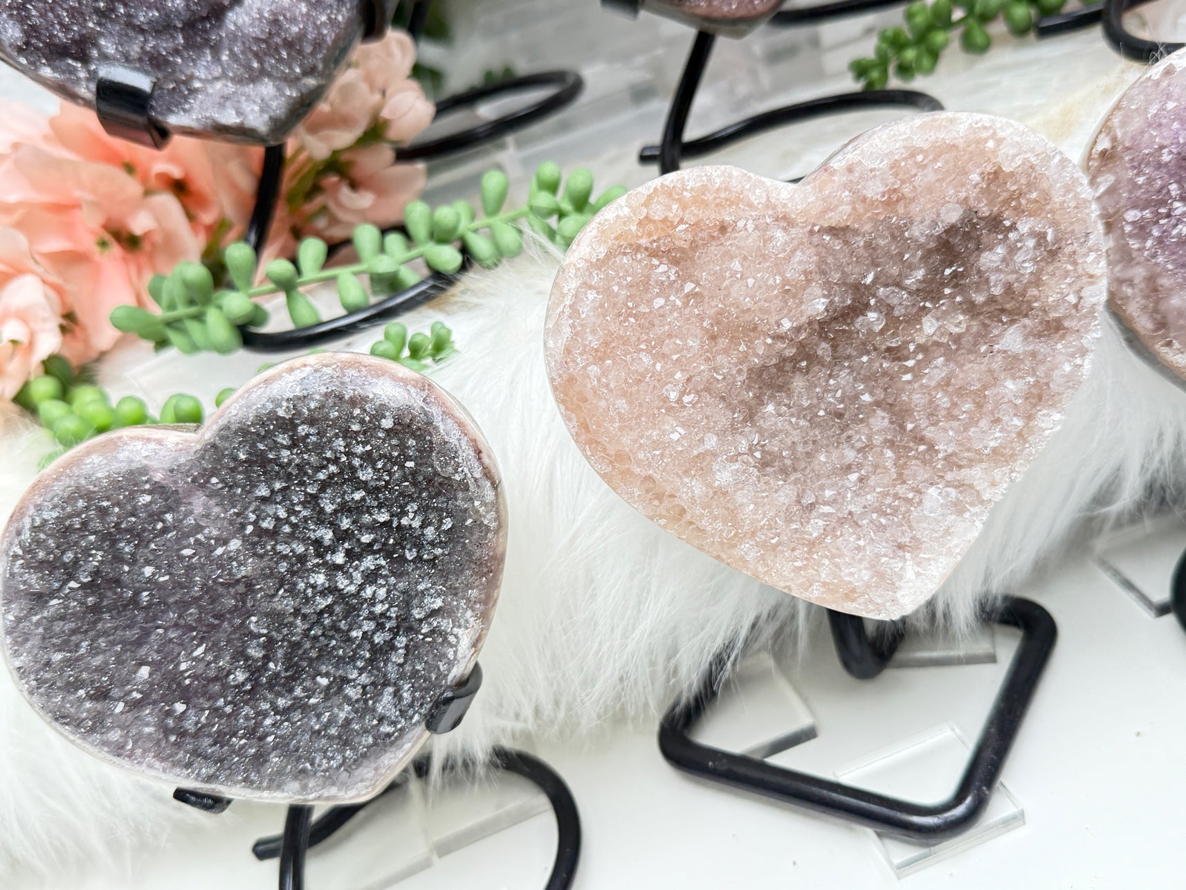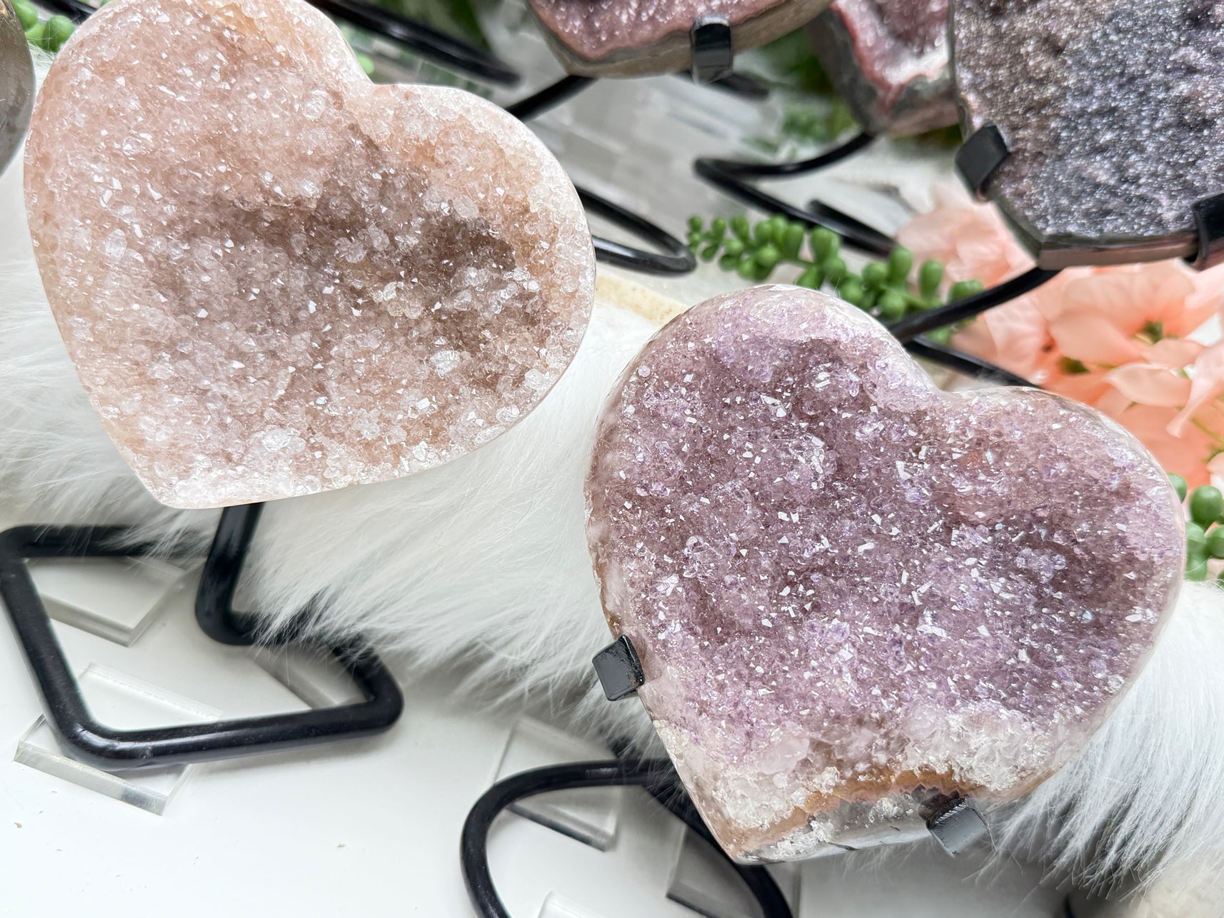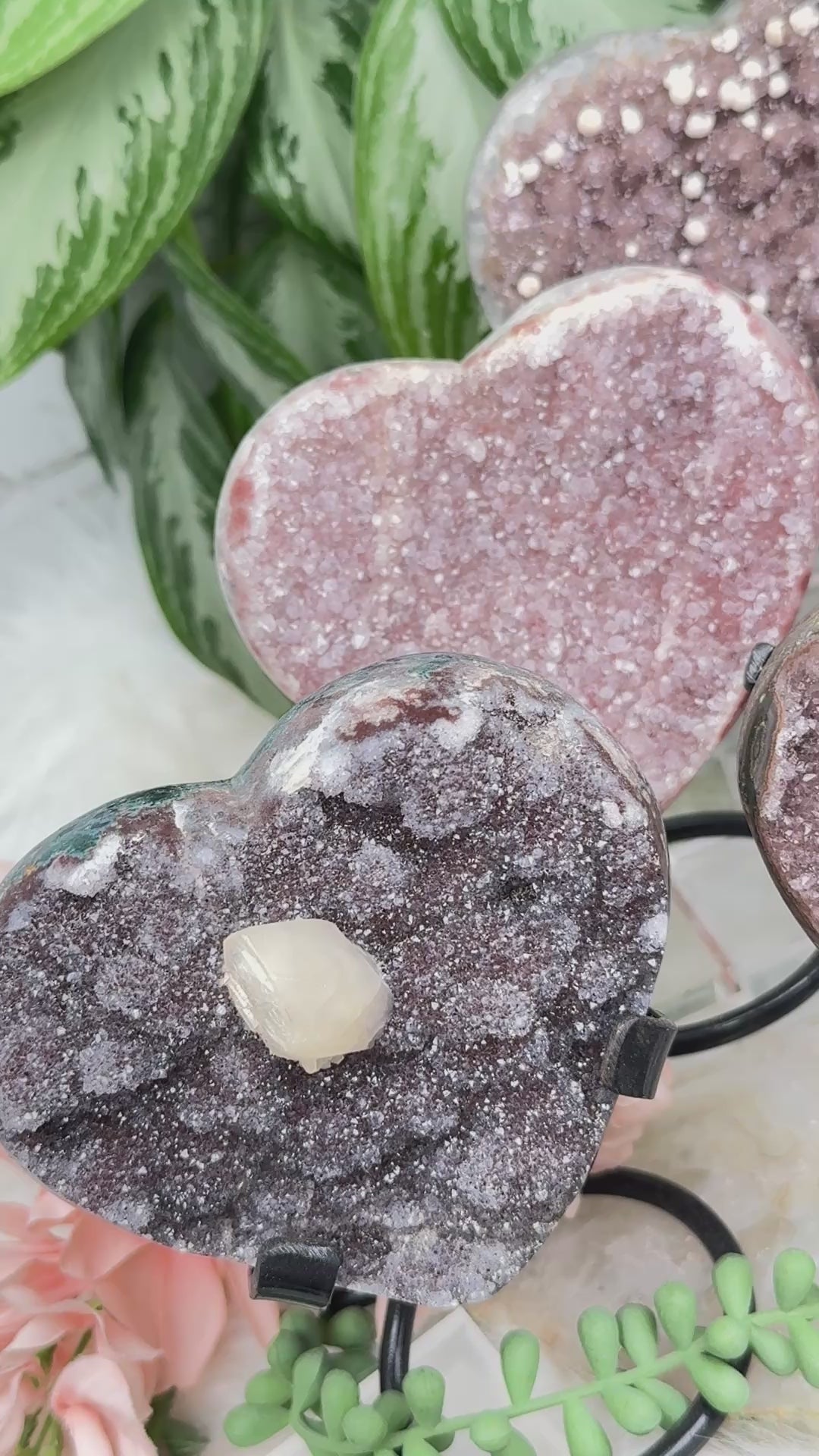 Uruguayan heart crystals that come with their own custom black metal stands. Super sparkly piece, take a look at the video! These amethyst hearts have a variety of colors, sizes, formations, and more unique features including calcite and banding. There are reds, blacks, purples, and more. All of these can come off of their stand except for one, the lightest pink-ish colored one that has a different stand style without 'arms'.