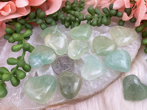 Fun UV Reactive Madagascar Green Fluorite heart crystals. These fluorite hearts have an overall beautiful green color with some having a slight hint of veining in them. These fluorite crystals are UV reactive, so they will glow blue under the right light! You can swipe through the photos to see what they look like!