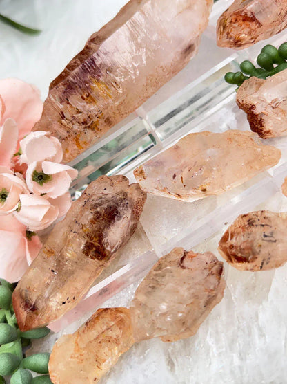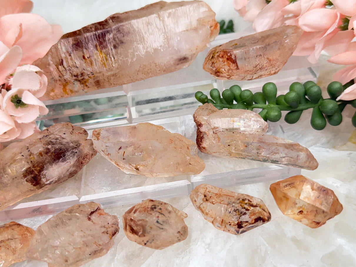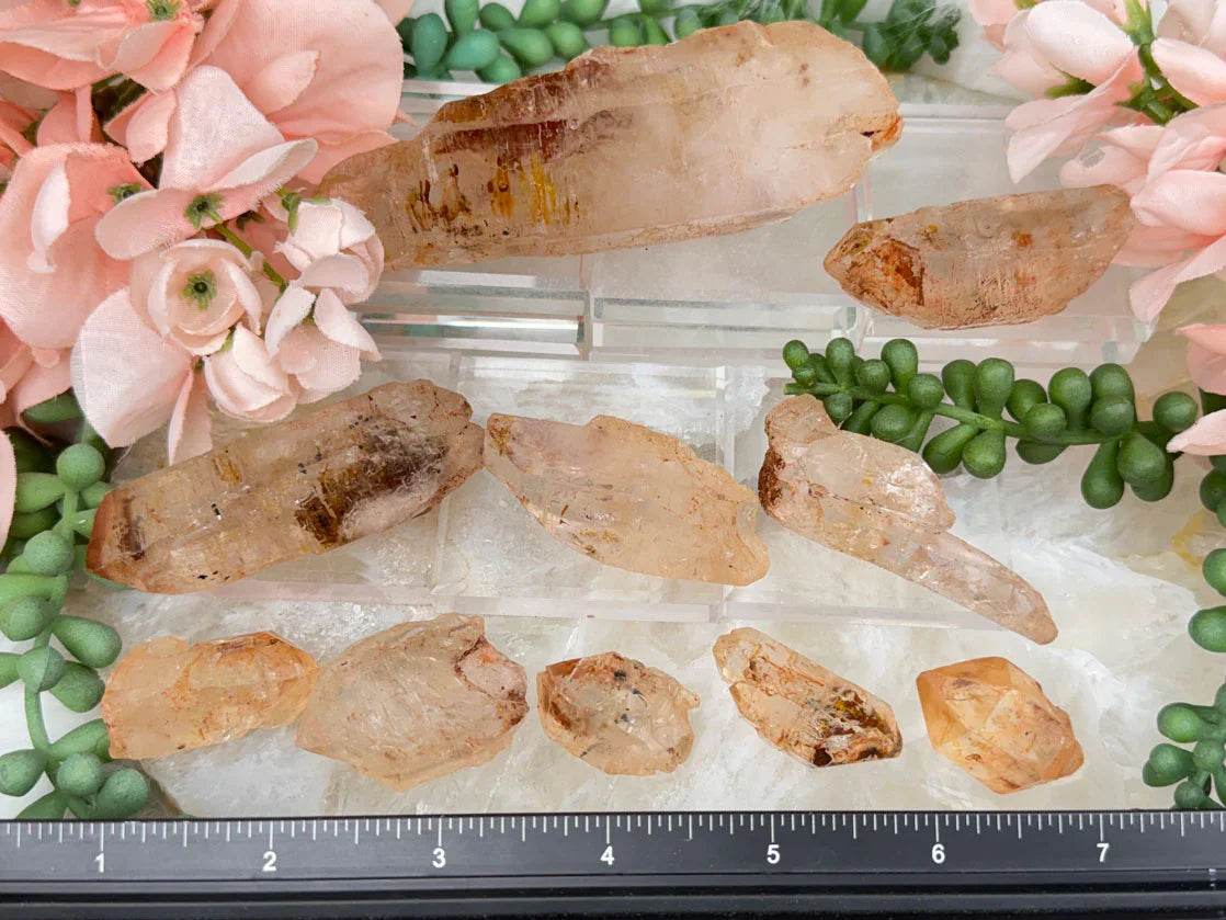 Awesome and unique UV reactive petroleum quartz points from Madagascar. These all have an overall orange hue to them in normal lighting. Under UV light, they will glow a vibrant yellow coloring due to the petroleum inclusions in the quartz. Some of these will have a natural double termination.