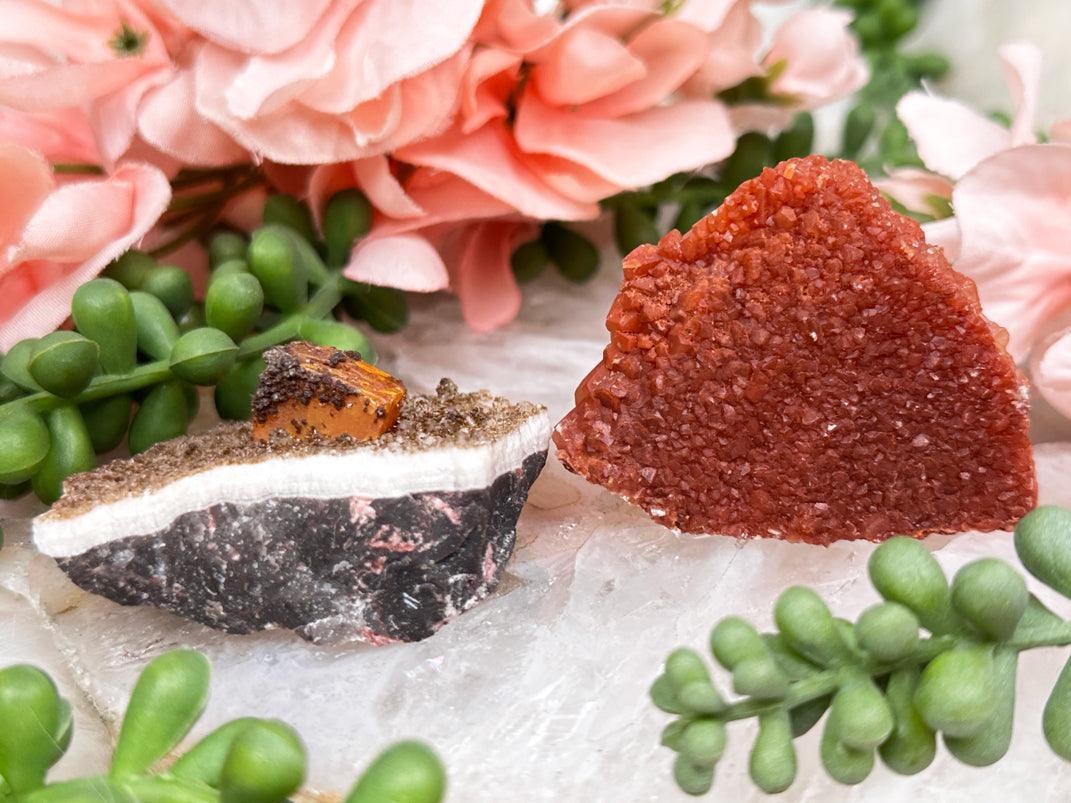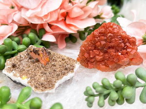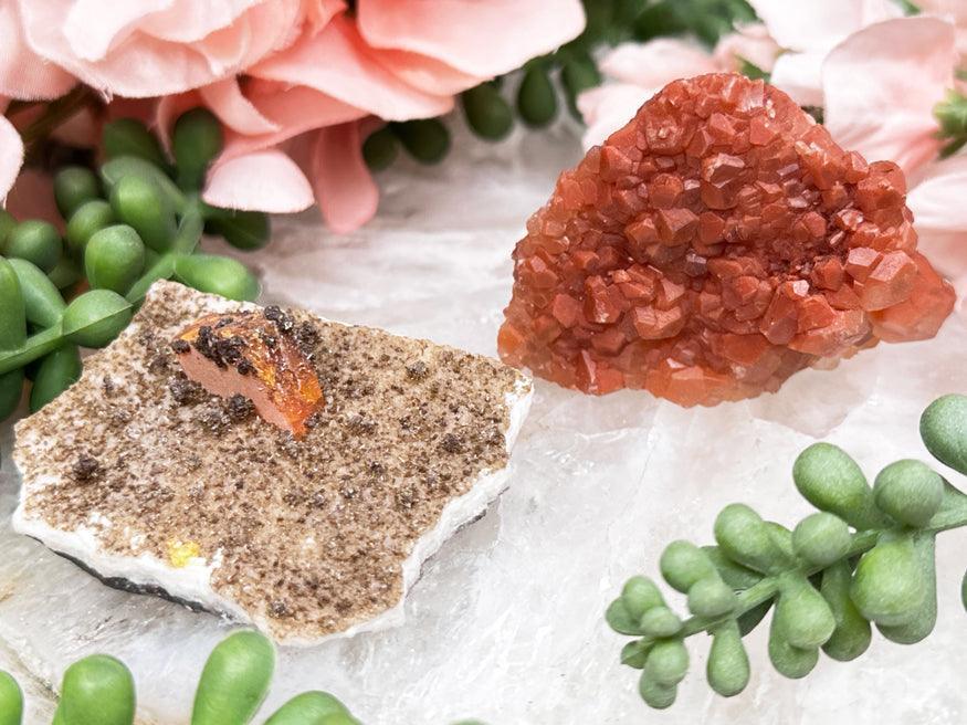 Unique little crystal specimens! The one on left is Wulfenite and Vanadinite from Mexico. It can stand on its side or lay flat. Please note this piece has a 'specimen number' on the back that I do not believe can come off. The piece on right is orange calcite from China. It can also stand up or lay flat.