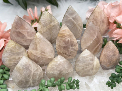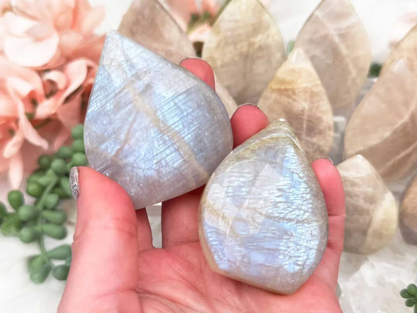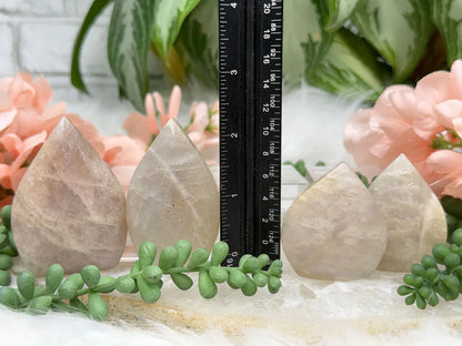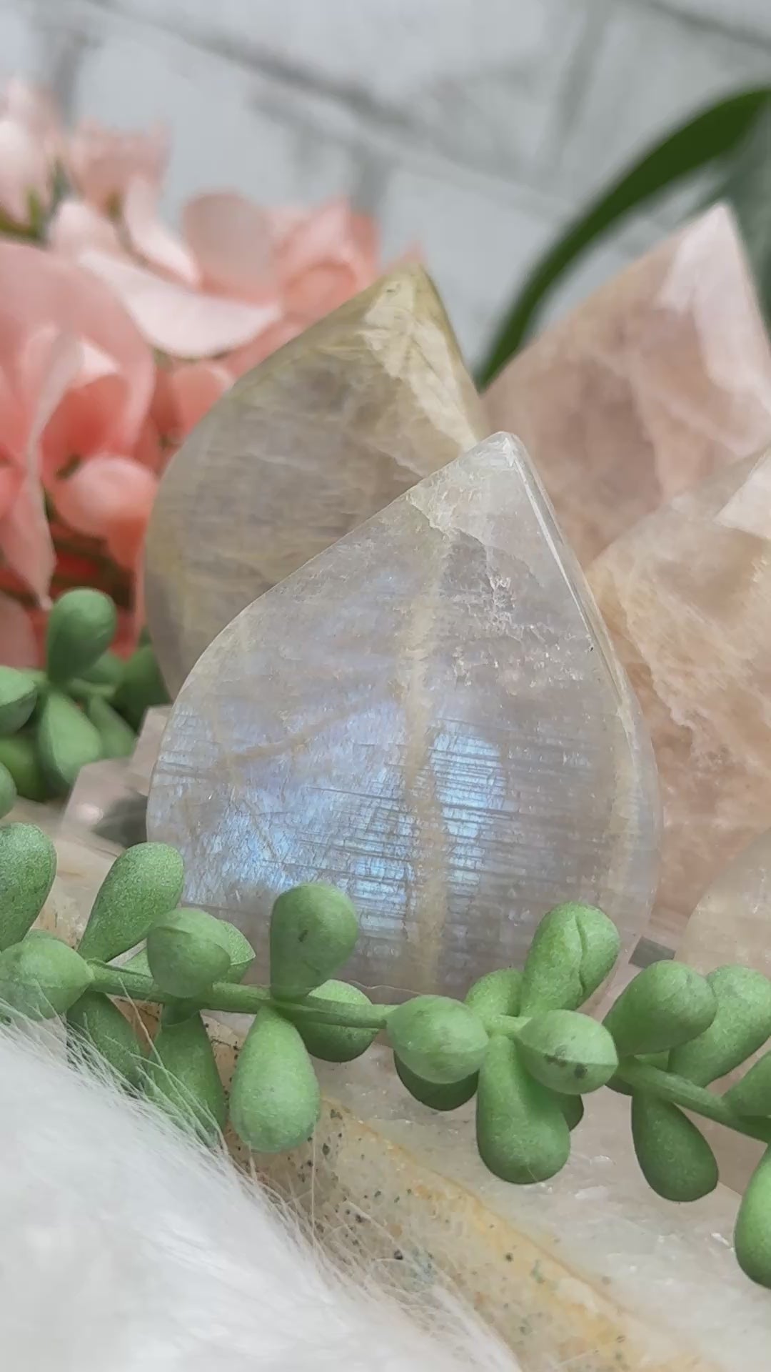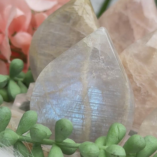 Beautiful white moonstone mini flames with blue flash on them. The flashes are more of a subtle blue gray coloring versus a vibrant flash. Some will flash more than others though. Overall they are an off-white coloring, but they have some lighter and darker tan veining or spots throughout them as well. Be sure to take a look at the video for the best look at them. A couple of these have sunstone in them too if you look closely in the video! The photo with the ruler shows the tallest and shortest pieces to give an idea of the sizes.