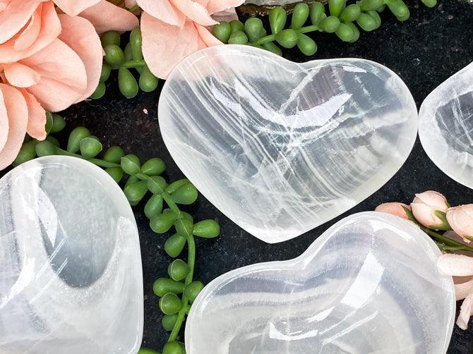 Cute white onyx heart bowls perfect for keeping small jewelry, crystals or trinkets. These onyx heart dishes have an overall white coloring with banding and lines in the formation that will vary. These are a shallow bowl, but can still hold some goodies! Great for a nightstand or somewhere you tend to take off your rings. From Mexico.