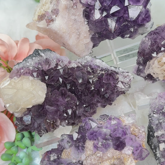 Super cute and unique amethyst clusters from Brazil. The the biggest one, back left, is a vibrant chunky purple amethyst paired with an equally chunky white calcite piece that also has amethyst grown into it as well as sparkles under the right light. Also has cacoxenite. This piece can sit a few ways. The others are a bit smaller but just as awesome to look at. Some also have cacoxenite in them. Some have UV reactive calcite that glows a light pink under UV light, while some do not. Some also have 'sugar' crystals in a few spots.
