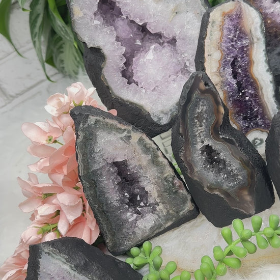 Striking amethyst and quartz 'cathedrals', aka standing geodes. A few different colors and looks from classic purple amethyst, to green and tan banding, and even some with gray chalcedony. The back has been coated with cement and painted black to give a cleaner appearance. These amethyst geode crystals are from Brazil. It's also called an amethyst cathedral.