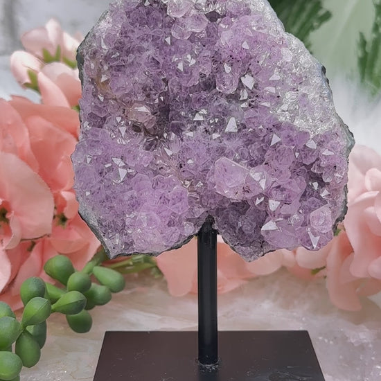 Repaired amethyst crystal cluster on black metal display stand from Brazil. A cute purple coloring with tons of sparkle. Please note this piece is REPAIRED down the center. You can see some of the glue on the face when you look closely. Take a look at the video to see it in detail on both the front and back. The back has been painted black.
