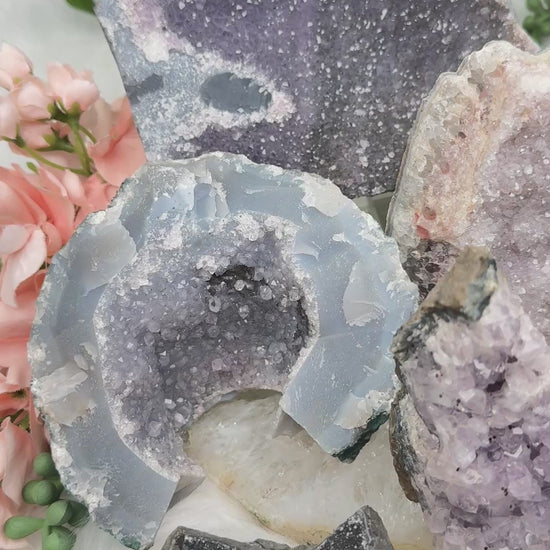Super cute amethyst geode pieces & clusters from Brazil! Some are geode ends (like if you opened a rock), some are clusters, and some just pieces. The large standing amethyst with white chalcedony has 'sugar' druzy coating all over it!! Beautiful formations and a cute look. These would be great for a boho house, beach decor, or really any home theme. Take a look at the video to see how each one sits and also for a full 360 look. Please note that none of these are UV reactive.