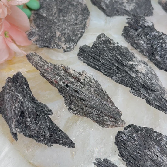 Black Kyanite 'fans' or 'blades' from Brazil. These rough stones work well for grids or have been quite popular for my wire wrappers!  Black kyanite blades are remarkable tools in the realm of crystal healing and energy work. These sleek, jet-black blades possess a range of benefits and versatile uses. One of their primary attributes is their ability to rapidly cleanse and clear stagnant or negative energies from both the environment and the aura. Holding a black kyanite blade during meditation or energy sessions can help to realign and balance your chakras, promoting overall energetic harmony.