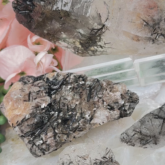Stunning black tourmaline rods in clear quartz points and pieces. Many of these do have actual points to the quartz. Some have a ton of sparkle due to how the tourmaline is growing within the quartz. A couple also have some elestial formation to them. The largest piece also has gold rutile in it. These raw tourmalinated quartz crystals come from Brazil.