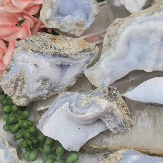 Stunning pastel Blue Lace Agate chalcedony crystals in matrix. These crystals have a very light blue druzy coloring with subtle agate banding (some more than others), and a light tan matrix stone. These have a super calming vibe to them due to their soft coloring and druzy sparkle. Honestly these crystals photograph terrible every time, but they are so pretty in person! Also called Blue Holly Agate.