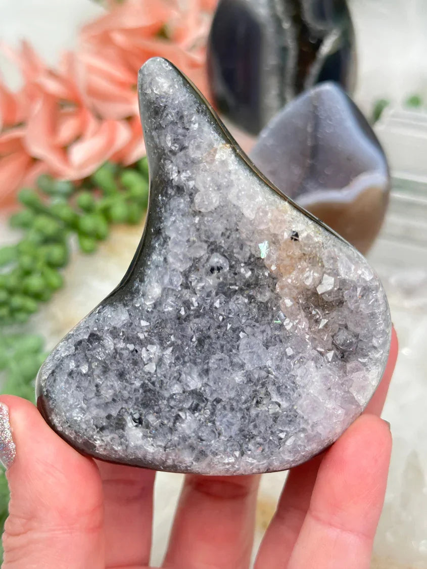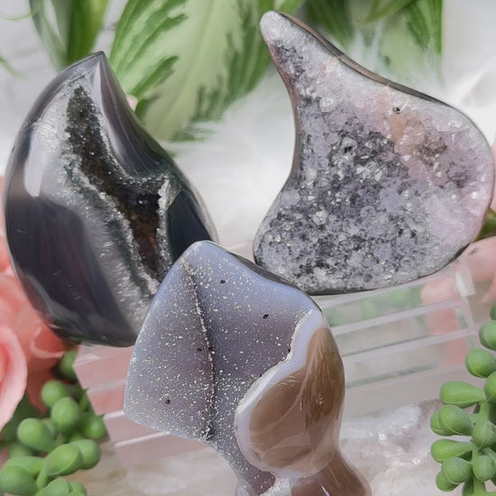 Super cute and detailed agate flames from Brazil A mix of colors, pattern and banding. They have a simple flame or teardrop cut. One is more of a traditional geode, one has druzy chalcedony, and one is a chunky quartz face.