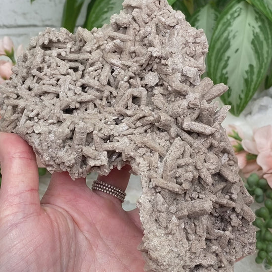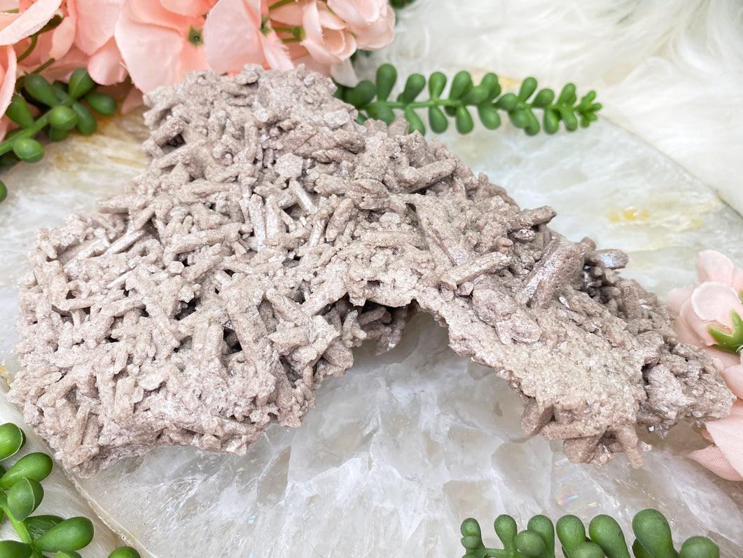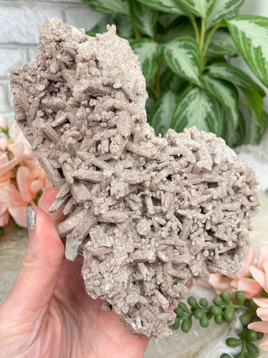 Quite an interesting formation of tan Cleavelandite (Albite) from Brazil. This piece has a couple different types of growths giving a cool contrast. One part is a large almost 'rod' like formation, and the other half has a mire intricate formation that gives off some nice shimmer. Nice large piece that will make a statement, but small enough that it won't take over your space.