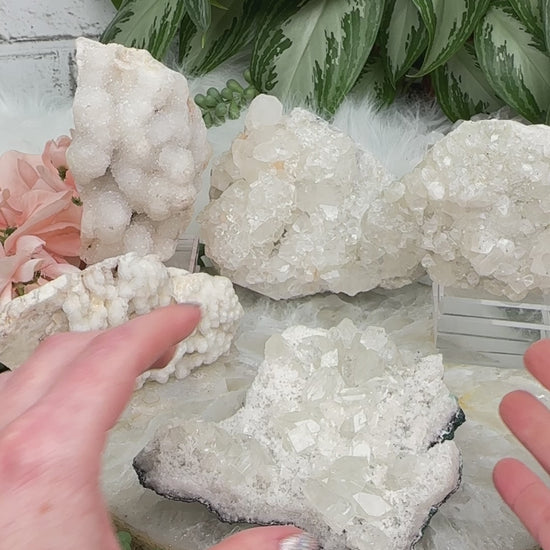 Cute chunky and sparkly mostly white apophyllite crystal clusters from India along with some that are mordenite, chalcedony, and some with peach stilbite mixed in. Some have a slightly gray coloring, while most are an overall white. Most of these will only lay flat, but some can sit up on a side. Take a look at the video to see how they sit or lay.