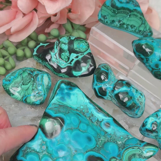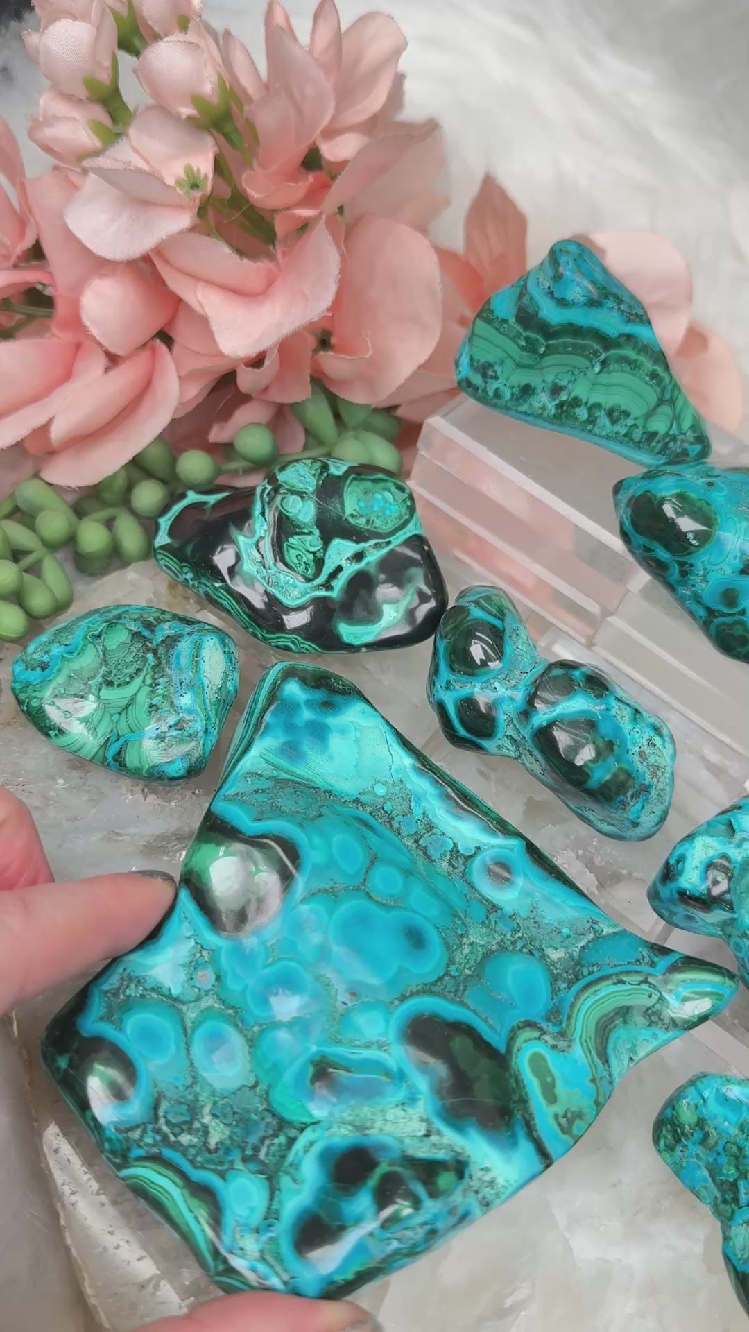 Beautiful pieces of combination blue Chrysocolla green Malachite from DR Congo. These chrysocolla malachite are semi-polished pieces so they maintain some of their natural surface but with a polish on them. The polish to raw ratio varies by each piece, so be sure to check out the videos for the best look at them. Some are more chrysocolla than malachite, and some are more malachite than chrysocolla.