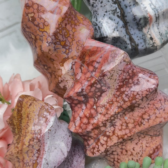 Amazing colorful Ocean Jasper flame carvings out of Madagascar. These flames have a variety of lined and orbicular patterns. There is an amazing mix of colors on each, red, pink, purple, orange, green, yellow, gray and more. Great pieces for your home or office decor. They are all super unique!