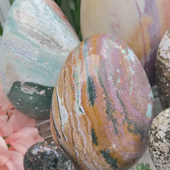 Cute and colorful ocean jasper freeform crystals from Madagascar. Some with pinks, some blue, tan, and everything in between. From large and chunky to small petite little babies. The tan and white piece even has some druzy quartz pockets. Take a look at the video to see them 360 degrees.