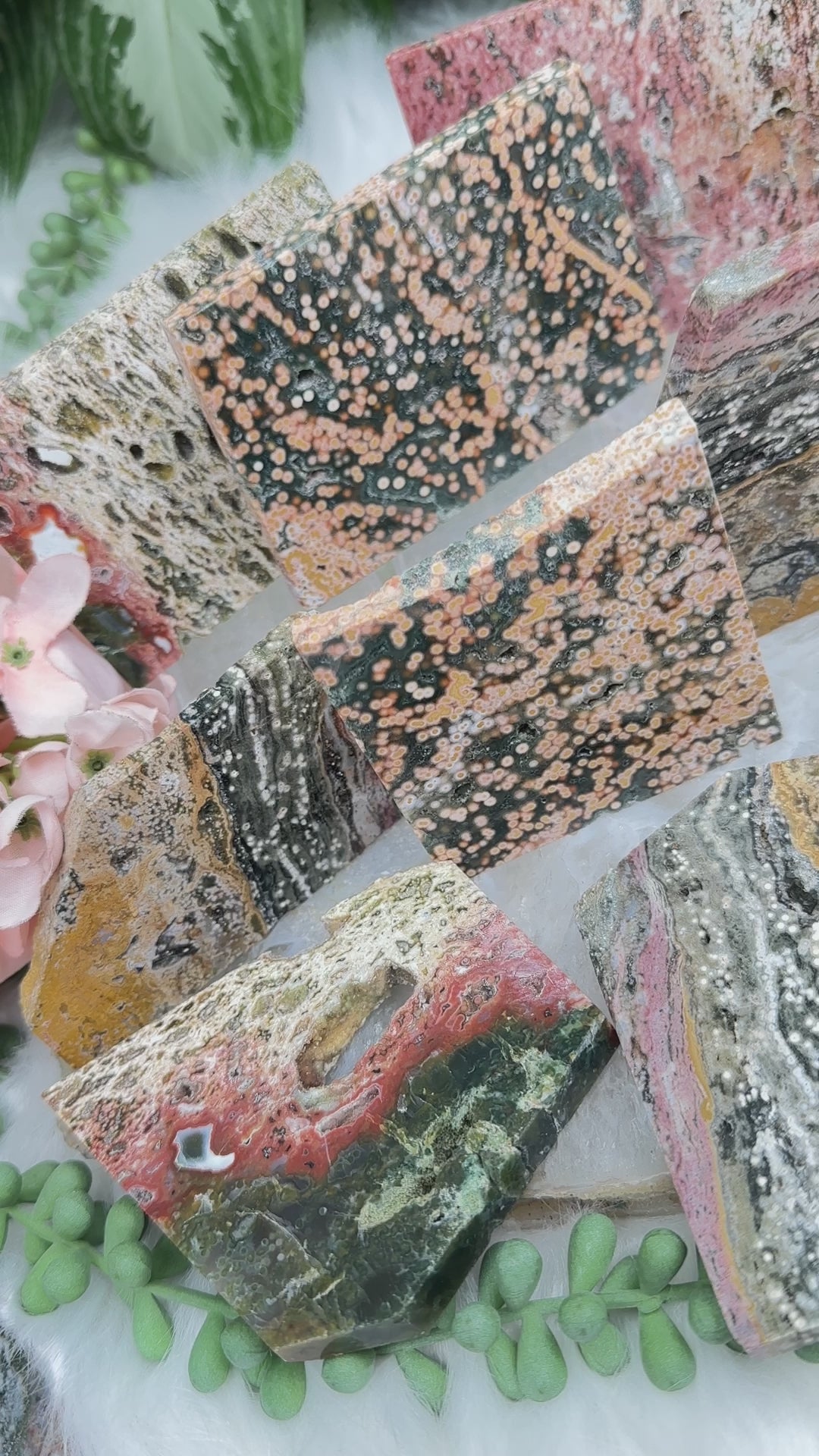 Amazing colorful Ocean Jasper slabs out of Madagascar. This newer pocket coming out has a variety of colorful petite orbicular patterns that are just adorable. There is an amazing mix of colors pink, green, yellow, red, green, white and more. Most of these have at least a tiny druzy spot, but many have more. Some even have druzy on the ends! Great pieces for your home or office decor. They are all super unique! Take a look at the video to see them in detail.