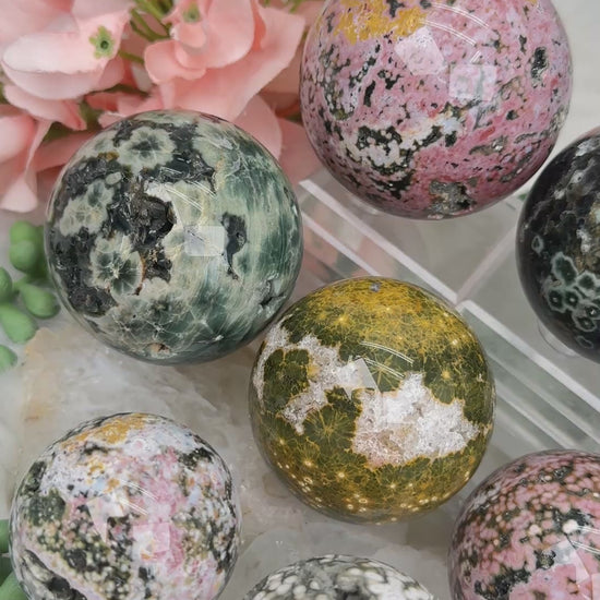 Amazing colorful Ocean Jasper spheres out of Madagascar. Have a variety of colorful petite orbicular patterns that are just adorable. There are also some green and yellow options with more of a flower pattern on them. There is an amazing mix of colors pink, green, yellow, white and more. Many of these have at least a tiny druzy spot, but not all. Great pieces for your home or office decor. They are all super unique! Take a look at the video to see them in detail.