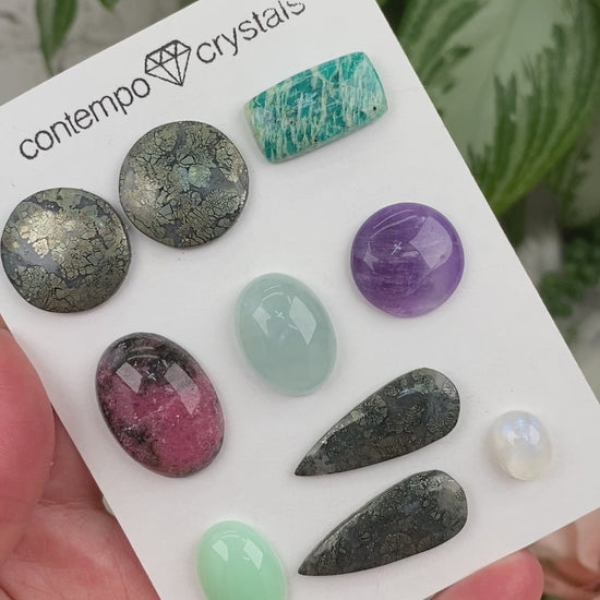 Indulge your creative spirit with these delightful cabochon stone sets, carefully curated to inspire your jewelry-making endeavors. Each set is a treasure trove of marcasite quartz, amazonite, amethyst, moonstone, chrysoprase, rhodonite, and aquamarine – a symphony of colors and textures waiting to be transformed into unique pieces of wearable art. As an artisan or jewelry enthusiast, these pre-made sets offer a fantastic opportunity to explore your crafting skills and bring your design visions to life.