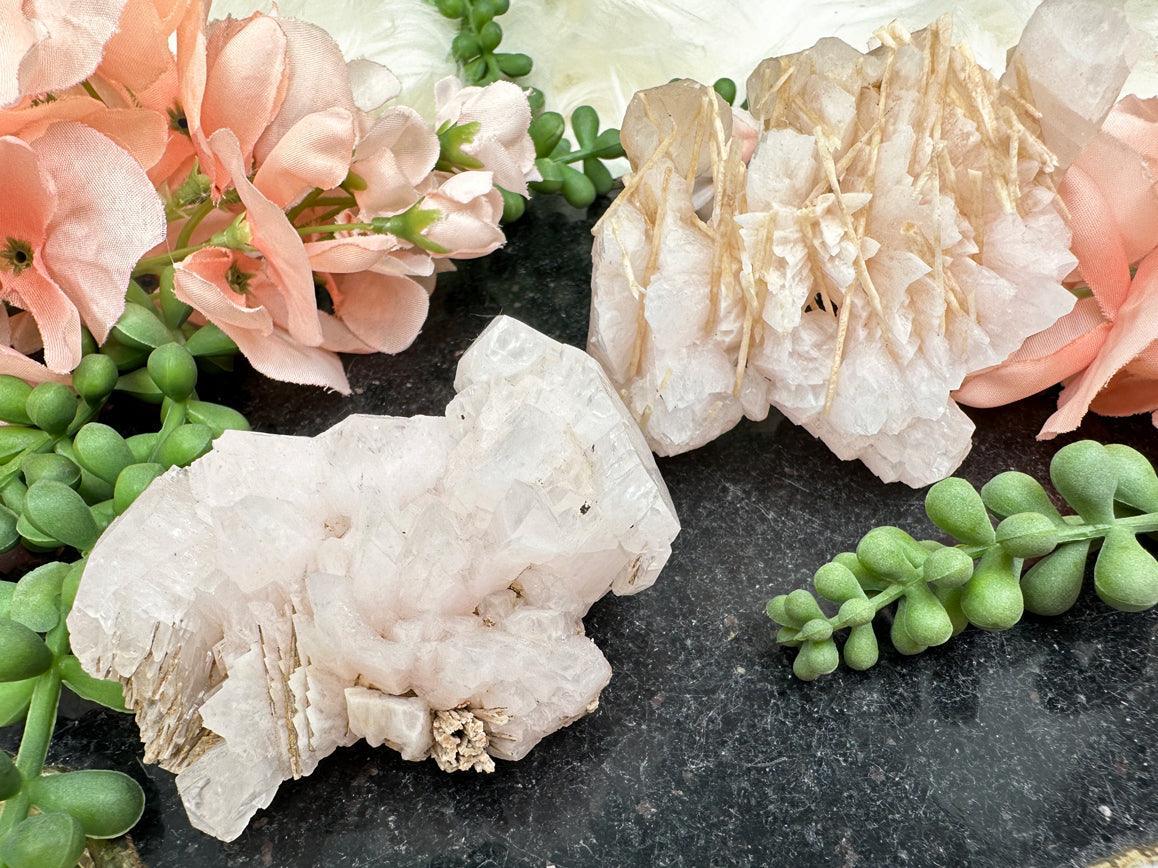 Adorable light pink Dalnegorsk Mangano Calcite crystal clusters with additional calcite rods throughout them. These double terminated raw pink calcite pieces are so incredibly beautiful and have the most amazing energy in person. This calcite will glow under the right lighting, aka it is a UV Reactive Crystal! This Manganoan Calcite crystal features a baby pink coloring with some peach or gray colored rods of calcite.
