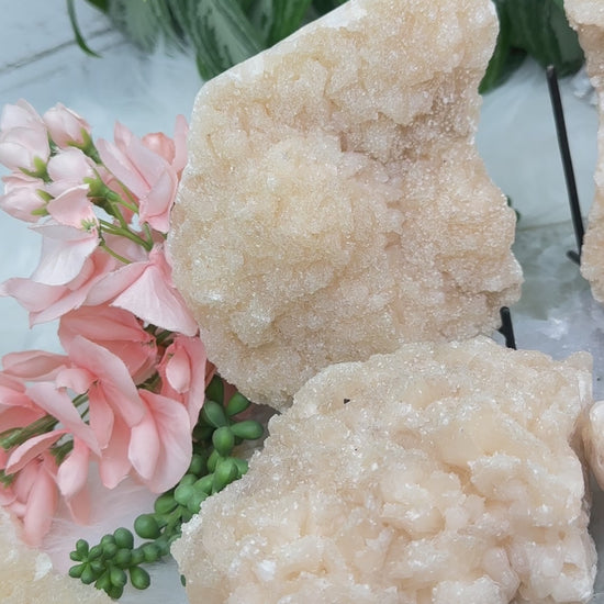 Chunky big peach stilbite crystals from India that are covered with little apophyllite crystals giving them all a sparkle. These are all overall and pinkish-orange coloring with a subtle shimmer when you move them (because of the growth formation). You'll want to take a look at the video to see them better! These pieces can only lay flat on their backs. Stands are not included, but I have some available on the website. The ones in the photo are the size 'medium'.