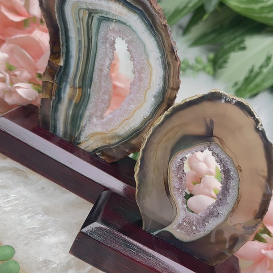 Uruguayan geode slice display pieces on a custom wood stands. These agate slice display pieces all have unique banding. Amazing and unique colors and lines. These pieces CAN come out of their stands.
