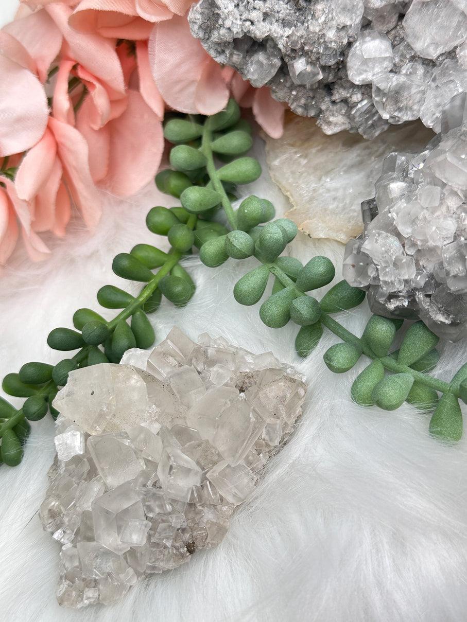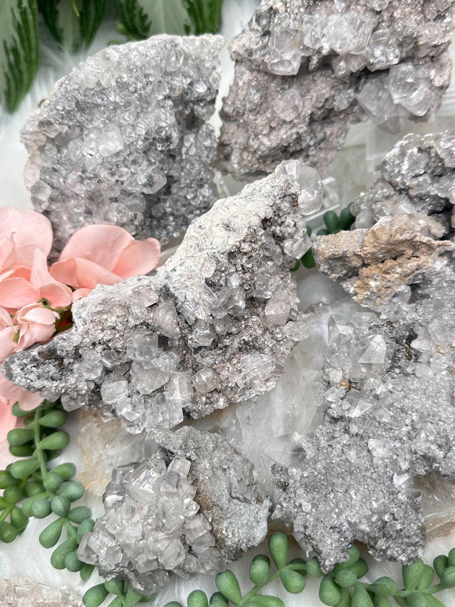 Beautiful Linwood Calcite crystal clusters that get their gray coloring from Marcasite inclusions. Such a unique and sought after crystal! These pieces come from the Linwood Mine, Buffalo, Scott Co., Iowa, USA. Overall they are a gray coloring, but some are more of a white or clear. Some have both! Some of these pieces have incredible rainbows and sparkle, so take a look at the video!