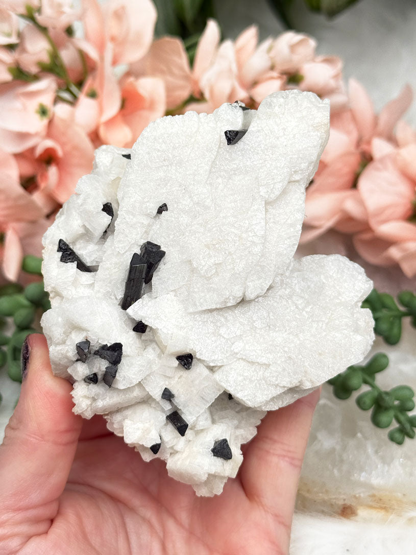 Striking one-of-a-kind crystal specimen from Astor Valley in Pakistan. Â This Green Elbaite Tourmaline Rods in White Albite has an overall black and white appearance with the exception of the one tourmaline rod that does have a translucent green appearance. Â The white albite has a nice shimmer to it due to its formation. Â This collector's crystal specimen can also stand on two different sides or lay fairly flat.