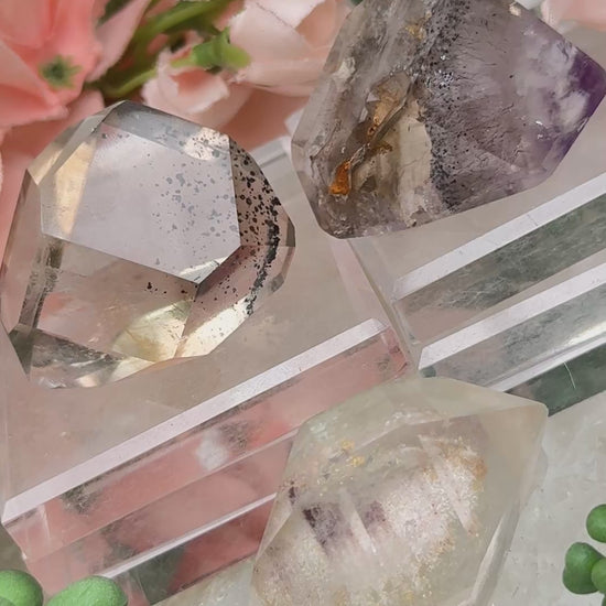 Super cute little geometric included quartz family pieces. One smoky with hematite, one amethyst with hematite, brookite and rutile, and one garden quartz. These pieces are from Brazil, and each unique in their own ways. You will want to see the video for the most detailed look, but the back left, the smoky quartz has adorable hematite flakes in it that will sparkle in the right light. The back right amethyst smoky quartz mix has hematite flakes as well. It also has black brookite strands as well as a silver rutile, and also has an elestial growth. This one will also shimmer in the right light! The front piece is a cute white garden quartz piece with a phantom growth inside. It will even shimmer a little under the right light too.