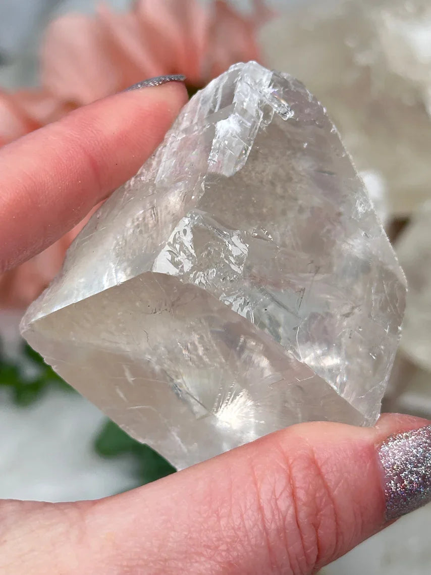 Indian white, clear, and honey calcite pieces, some with rainbows inside! These are a naturally cubic style cut and by no means perfect with lots of chips and weird edges. Take a look at the video to see if they have rainbows and all of the details.