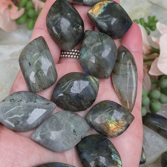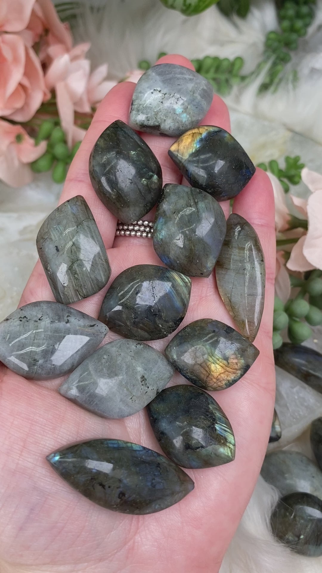 Cute little labradorite cabochon crystals for all of my jewelry makers out there! Â Or you can totally use this as a little pocket stone or mini worry stone. Â These are a variety of colors of gray to black in overall coloring. Â The flash colors will vary widely. Â Now I will say this aren't the flashiest pieces, they generally have a few little spots. Â You might get lucky with more flash, but I don't want to make it sound like these have more flash than they really do. Â So keep flash expectations low please.Â