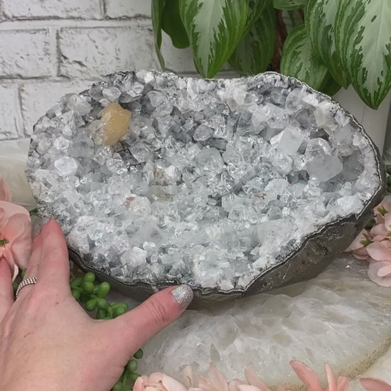 Super cute gray apophyllite geode crystal from India. This piece has clear and white apophyllite over a gray chalcedony which is what gives the overall gray hues. There is a piece of orange/yellow stilbite. Adorable rainbows in a few spots too! This apophyllite piece is a great size to make a statement without taking up too much space.