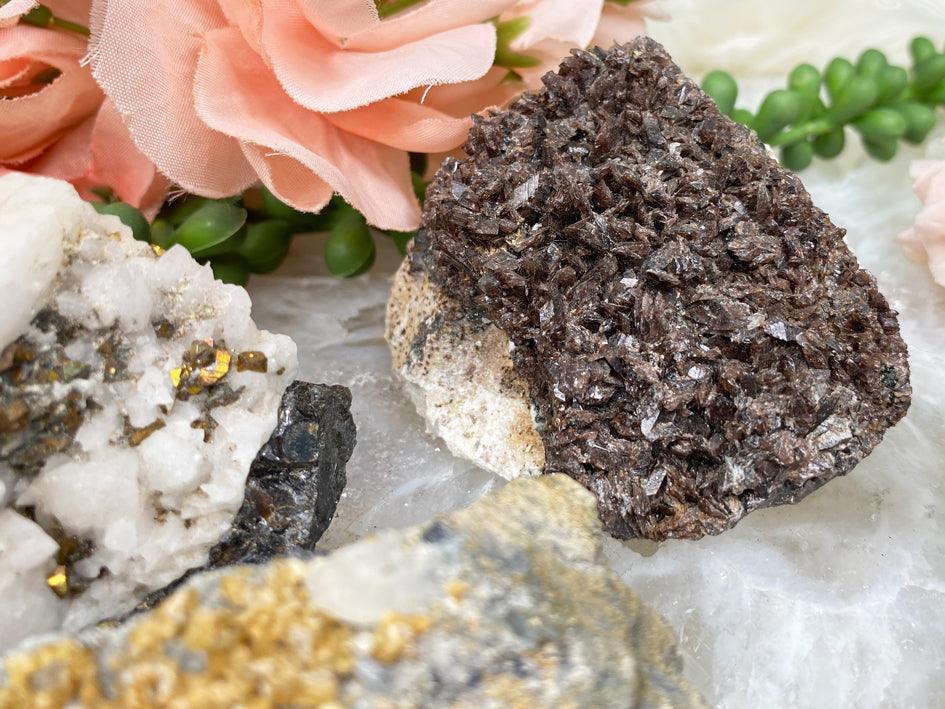 Some cool mixed specimens from Peru! A couple of these are even UV reactive (the whiter calcite ones), one is a dark brown calcite, a couple are siderite and/or orpiment. Be sure to handle the yellow/orange pieces carefully by washing your hands after holding. Check out the details on the video.