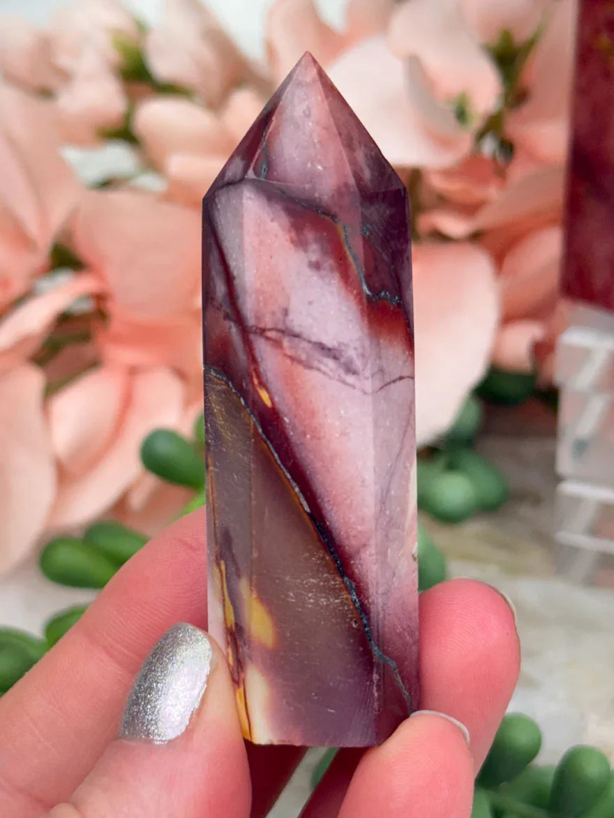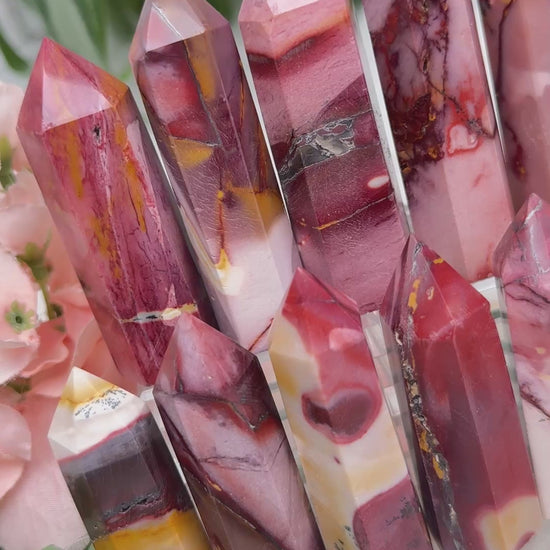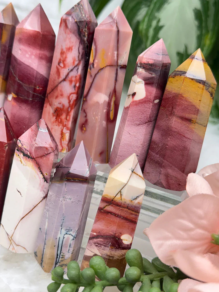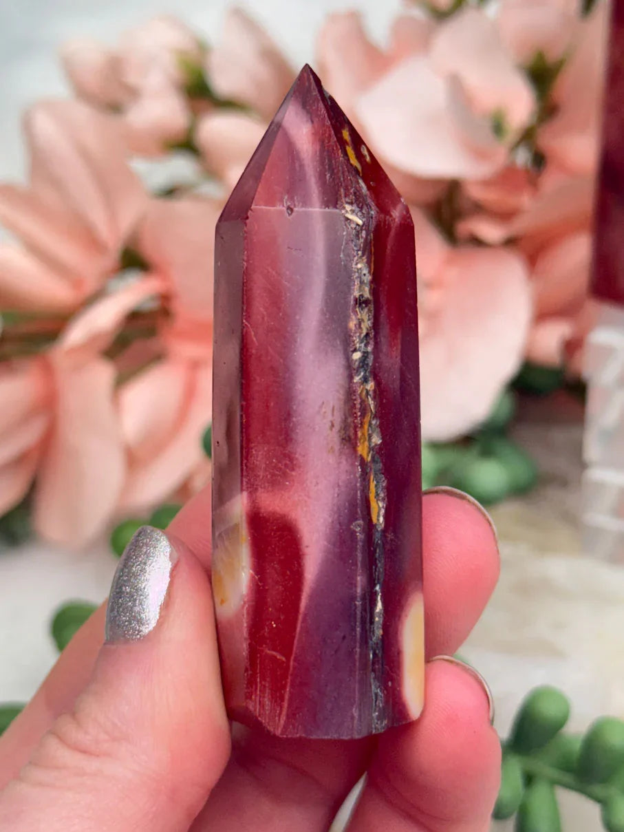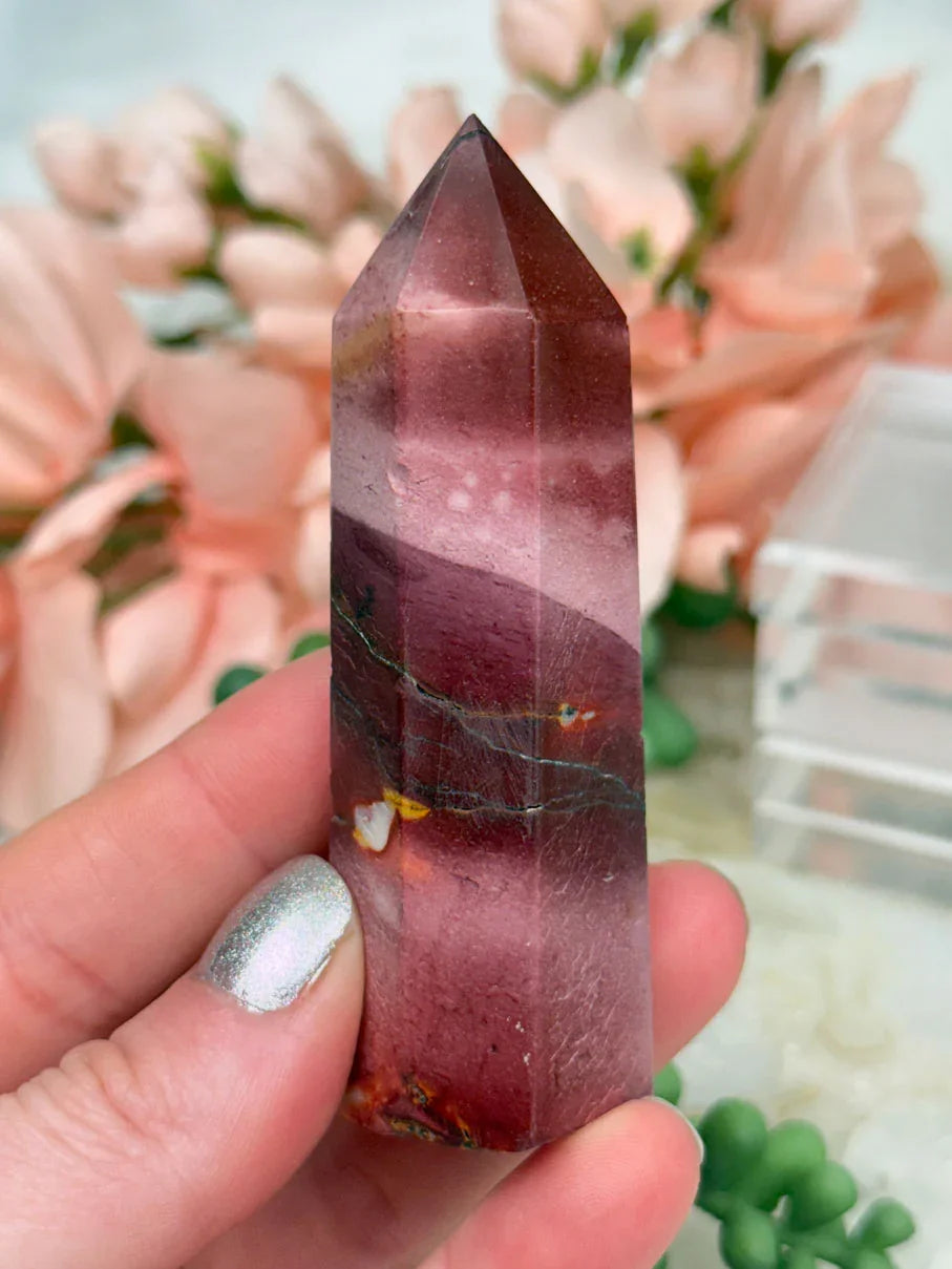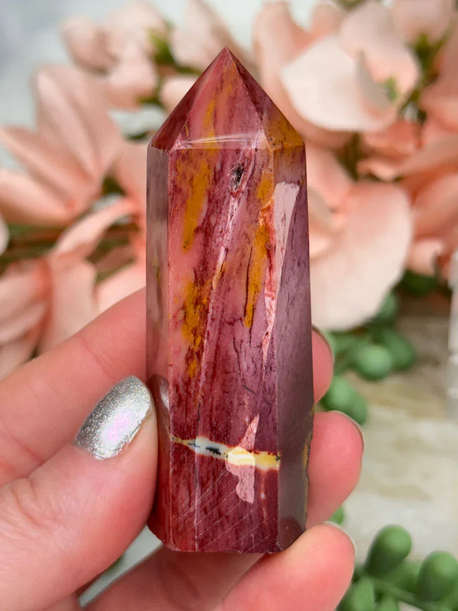 Adorable mookaite points. These are a fully polished point. Mostly red and/or pink, but some have subtle hints of yellow, white or purple in them. These smaller fully polished points may have a bit of a wobble or have a side that it leans toward, but they all fully stand ok and will have at least a couple sides where they will look like they are sitting fully straight. Be sure to look at the video for the full look!