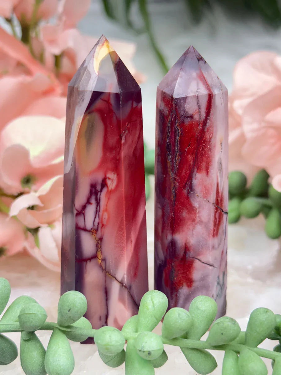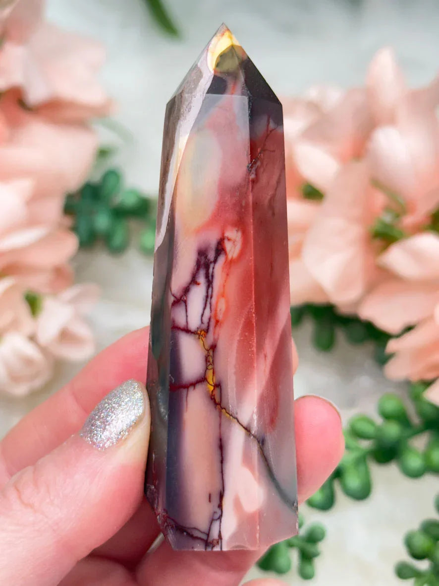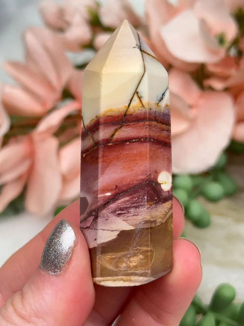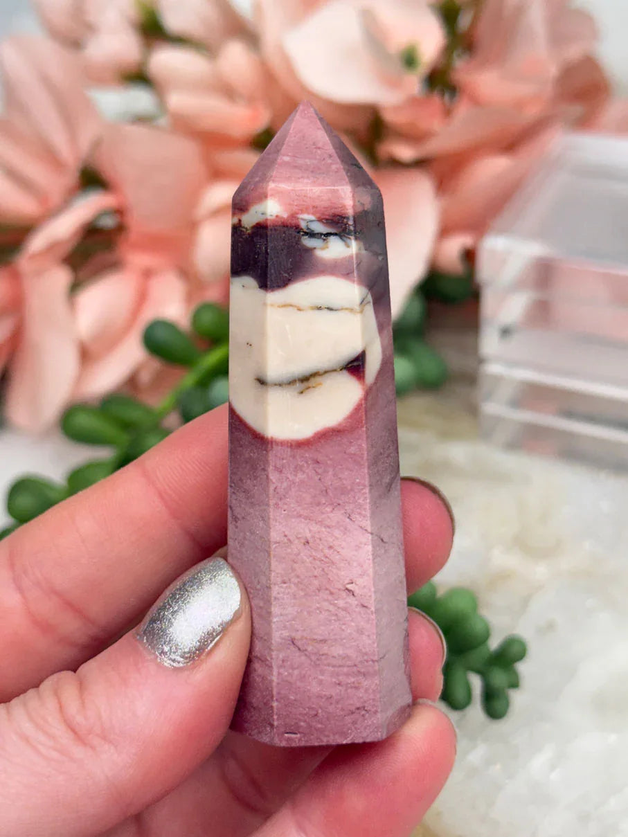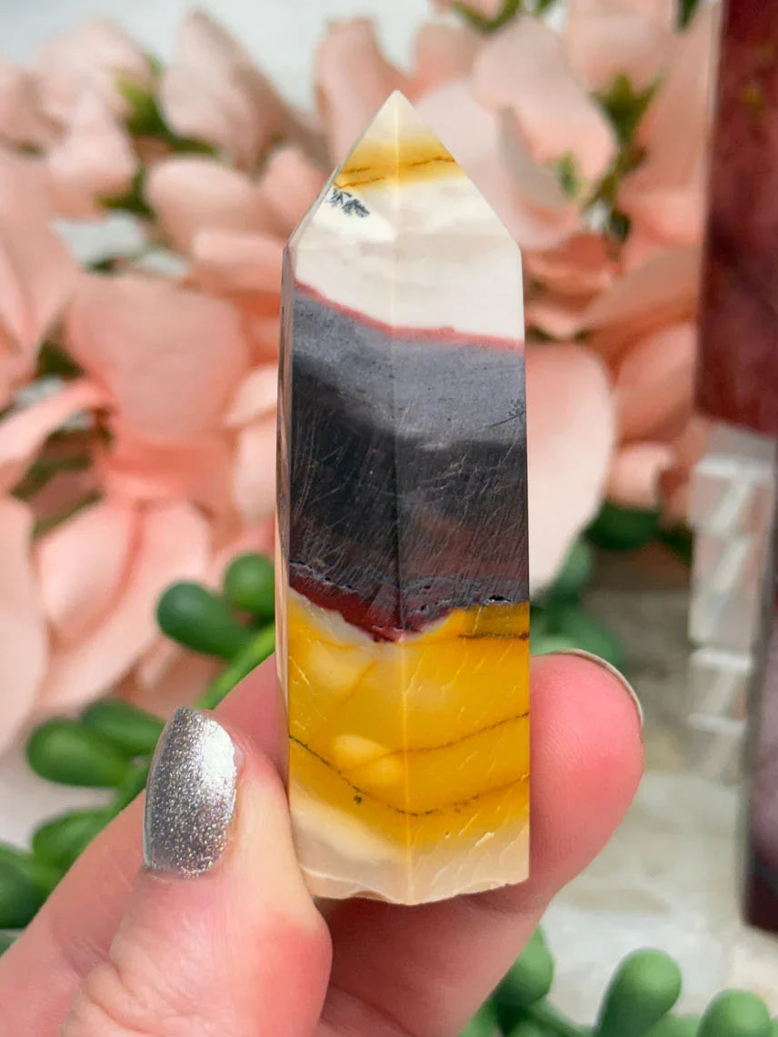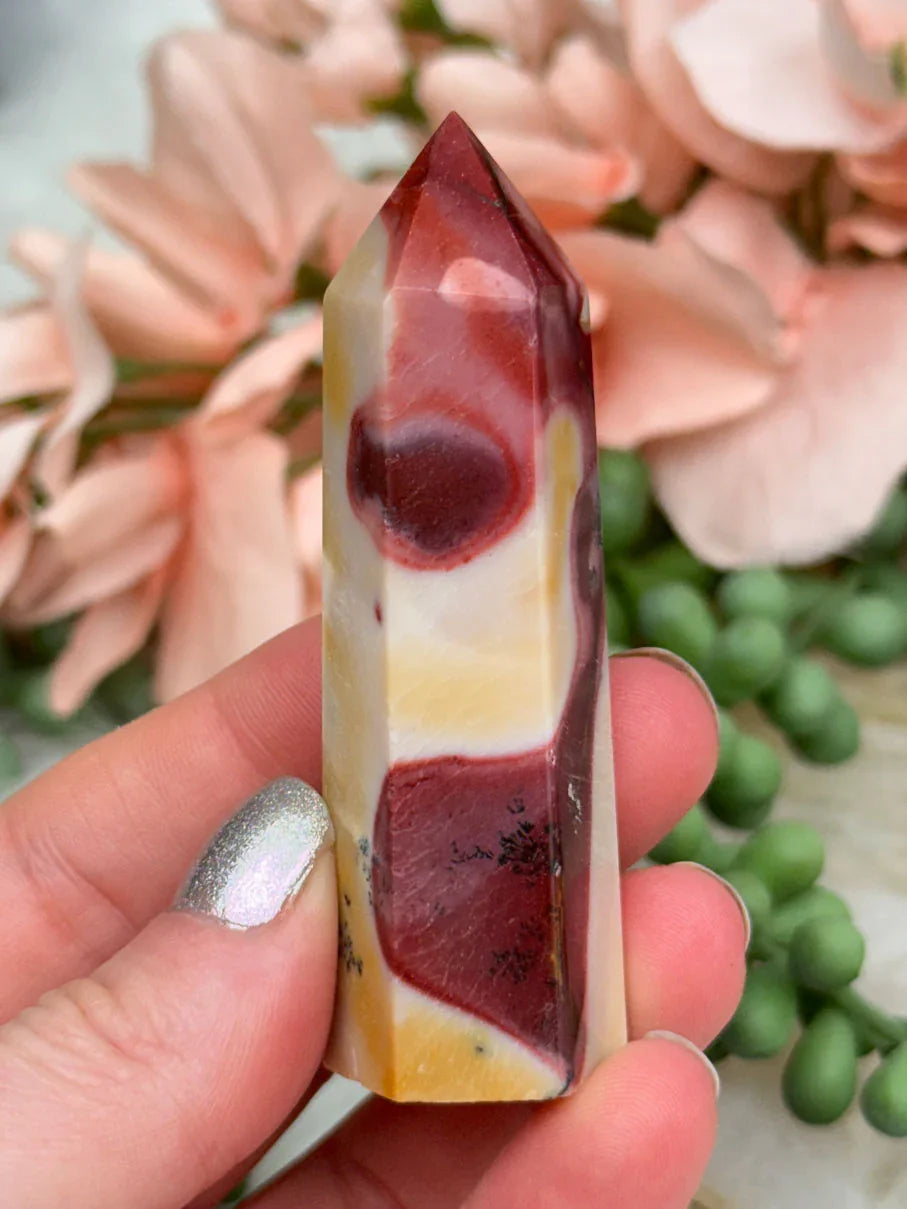 Adorable mookaite points. These are a fully polished point. Mostly red and/or pink, but some have subtle hints of yellow, white or purple in them. These smaller fully polished points may have a bit of a wobble or have a side that it leans toward, but they all fully stand ok and will have at least a couple sides where they will look like they are sitting fully straight. Be sure to look at the video for the full look!