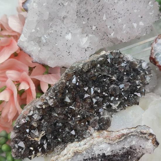 Super cool white and dark goethite quartz clusters from Morocco. These are either a white quartz with black rods, or a super deep brown coloring for the most part. Some have some lighter shades, and some you can see some golden goethite rods inside. Some pieces also have an off-white chalcedony growing over the top. Take a look at the video to really get the best look at each piece as well as to see how each one sits. Some of these pieces will flake a little in transit due to their matrix stones, but they are all intact.