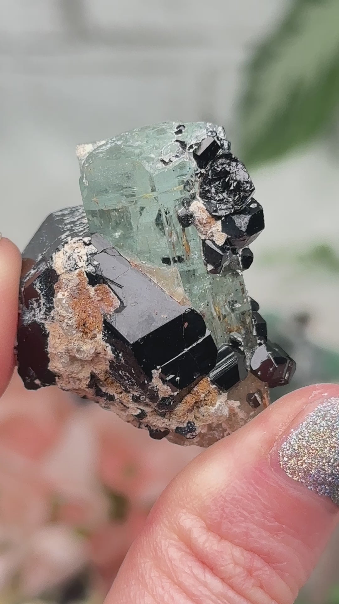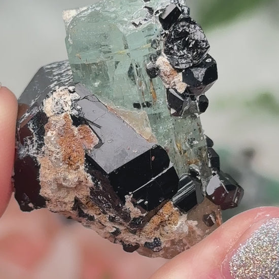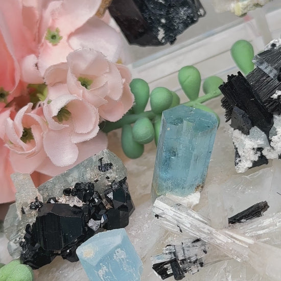 Tiny little mostly blue aquamarine and other beryl specimens from Namibia! These are going to be many colors of beryl including blue (aquamarine), clear (goshenite), and green (but really just a greenish blue hue), but most are aquamarine. Some are mixed with black schorl tourmaline, some white microline, and a couple with mica. Some are just beryl on their own. Take a look at the video to see the details on these small pieces. You could even grab an acrylic square to mount these on!