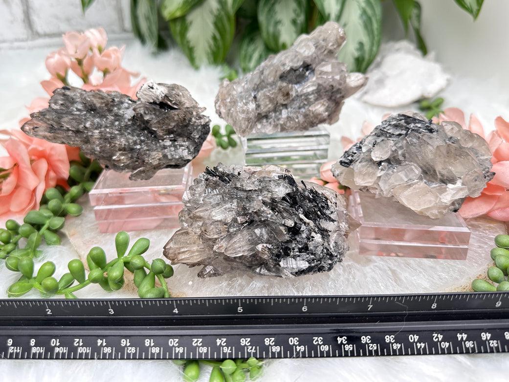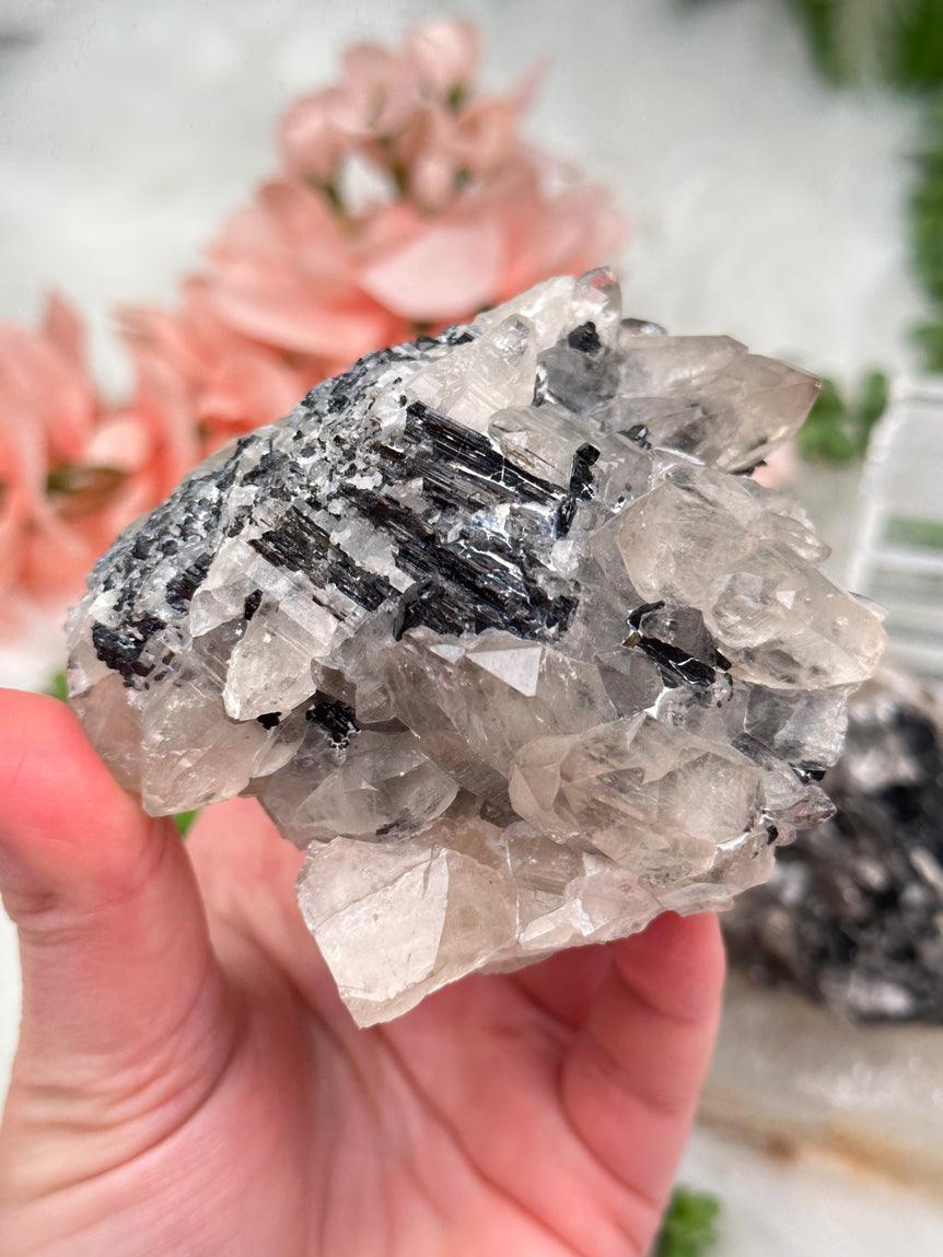 Stunners that have been hidden in a warehouse for the past 30 years! These black tourmaline in natural citrine specimens are from Brazil. These all have adorable points and formations that make them sparkle and shine. The black tourmaline is growing within the light citrine crystals giving them a darker appearance in many spots. Choose your exact piece!Â