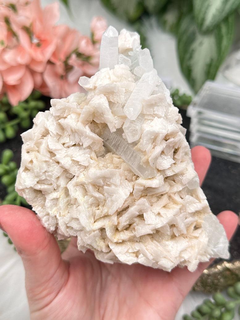 Stunning white and gray quartz clusters with contrasting light pink dolomite from China. Tons of detailed quartz points with pink dolomite growths throughout. I love the cool color vibes of these! Some of these even have pyrite in them, so keep an eye out for that!